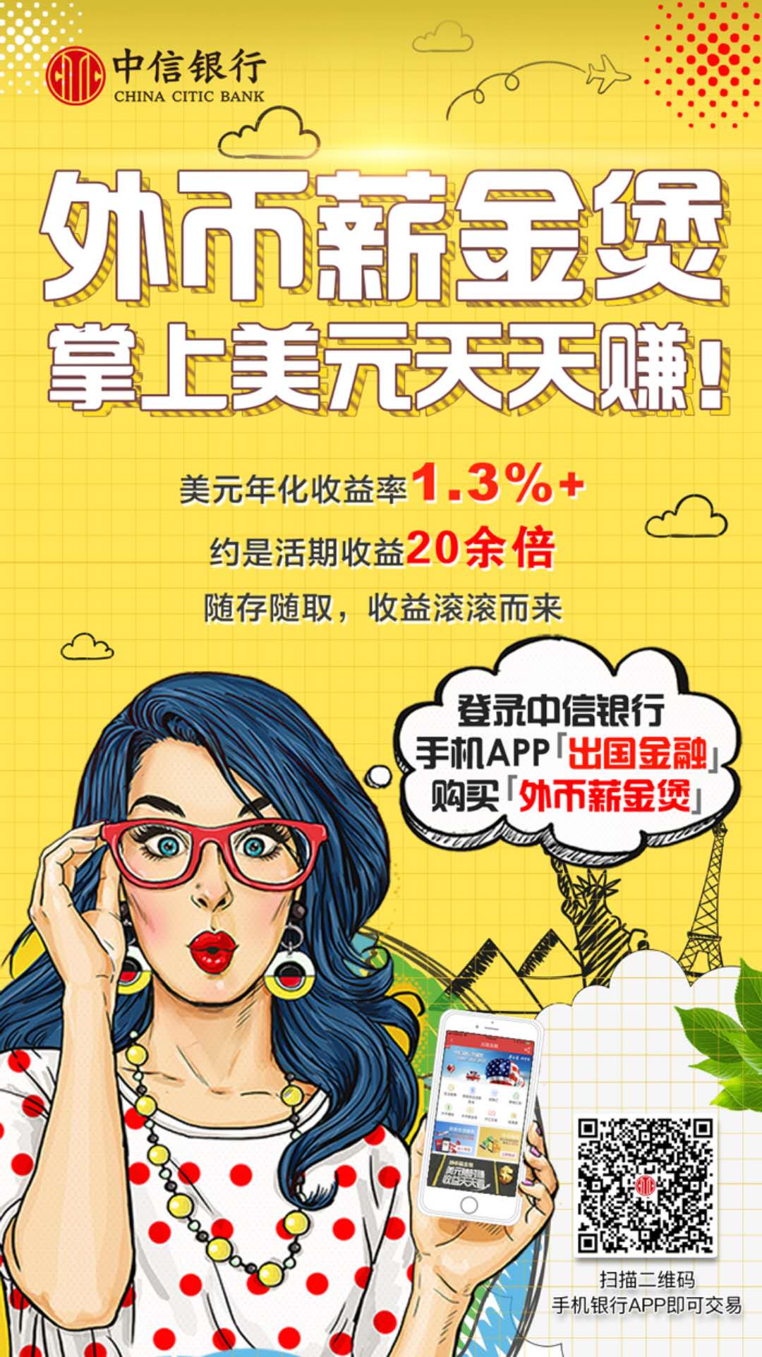 手持美元的朋友,如何让躺在账户里的闲置美元升值吗? 中信银行广州分行提醒广大客户,可通过中信银行推出的信汇投资平台购买“外币薪金煲”产品,“外币薪金煲”是中信银行设计推出的外币现金管理产品,具有随存随取,收益稳定的特点,填补了国内外币现金管理工具的空白。近期推出的美元产品年化收益率超1.3%,约为美元活期收益的20倍,实现兑换投资。