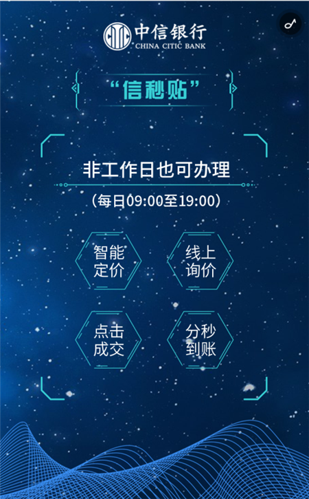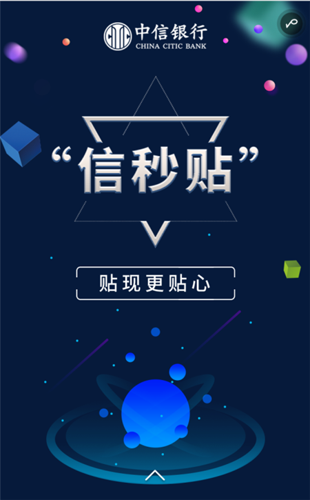 “信秒贴”产品定位于“支持普惠金融,发展绿色信贷,助力小微企业”,是由客户线上自助发起贴现申请,后续由中信银行系统全自动完成放款的互联网时代的高科技产品,主要服务于中小企业银票贴现业务。