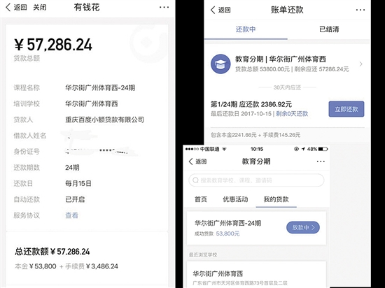 “交钱的时候,工作人员说可以‘分期付款’且不需要利息。他拿走我的手机,然后帮我下载了用于贷款的APP,拍了我的身份证和我本人,说这是必要的程序。我当时并不知道他正用我的名义在APP上贷款。后来我一查才发现,每个月的‘手续费’很高,最后我迫不得已一次性还清了5万块钱。”一名广州大学生说。