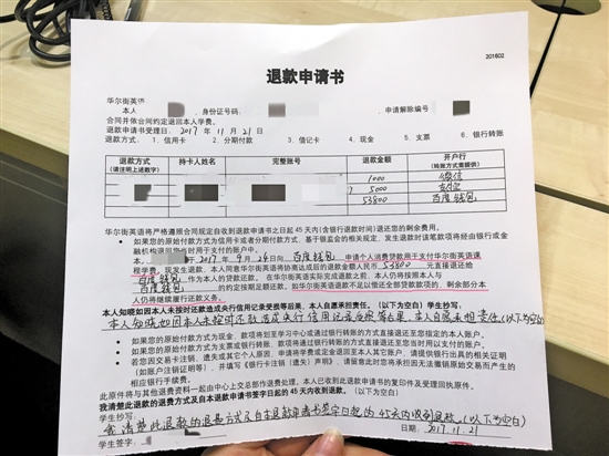 递交退款申请书后,华尔街英语并没有作出任何回应。无奈之下,家长向公安机关求助。一个月后,在民警陪同下,我再一次来到华尔街英语。当时,副校长出面协商。直到此刻,我才知道自己的退款申请一直被扣在“班主任”手里,并早已错过了“七天无理由退款”的保护范围。