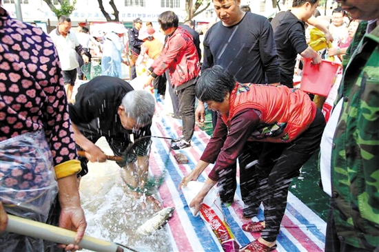 甘棠村村委会门前球场上,一条“甘棠村迎新春年年有鱼——分鱼活动”告示高高挂起,一个由防水布临时搭建的大鱼池早已筑起,生猛的草鱼来回游动,不时溅起水花,甘棠村村民从四面八方有说有笑地涌过来,不一会儿便将球场围得水泄不通。