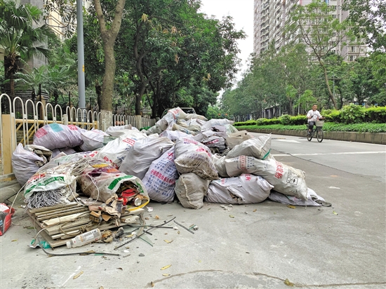 记者3月31日在天河区华景北路翠安侬苑小区门口看到,多个装有装修垃圾的麻袋堆放在车行道旁,不仅对行车行人造成影响,也对市容环境造成影响。