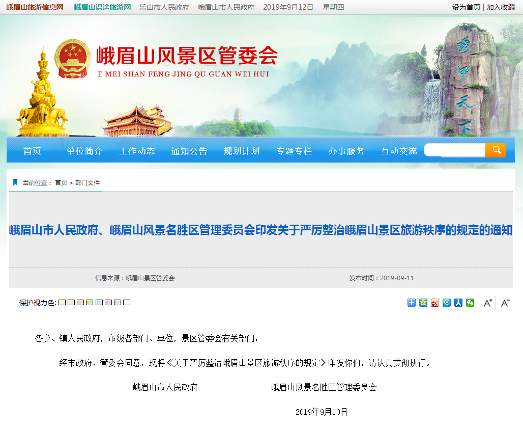 11日,峨眉山景区管委会在其官网发布了《峨眉山市人民政府、峨眉山风景名胜区管理委员会印发关于严厉整治峨眉山景区旅游秩序的规定的通知》,通知称,为保护峨眉山文化与自然遗产,维护国家级风景名胜区和国家5A级旅游景区荣誉,严厉整治峨眉山景区旅游秩序,确保长效治理,根据《中华人民共和国治安管理处罚法》、《中华人民共和国旅游法》等法律法规和政策,结合景区实际,制定本规定。