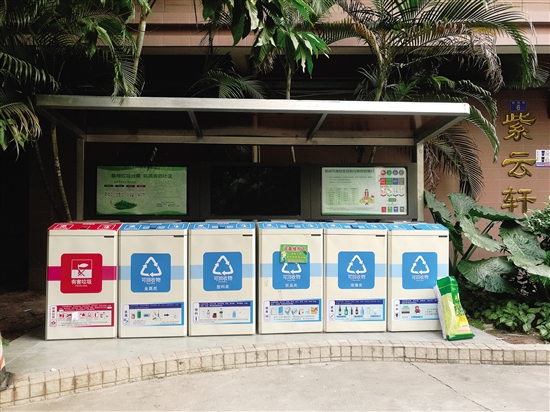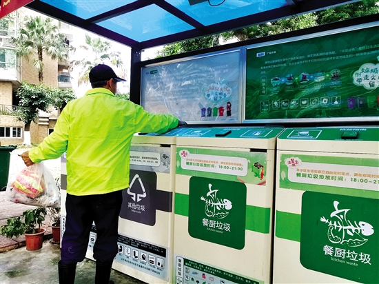 ■番禺区大龙街翡翠明庭的定点投放站设有智能垃圾分类桶,居民根据规定分类投放垃圾可获得积分,用来换取礼品。新快报记者 谢源源/摄