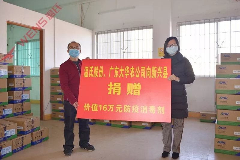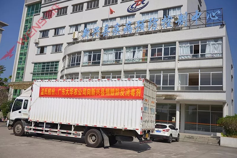 此外,广东温氏大华农公司通过广东省新兴县红十字会,向新兴县捐赠3吨菌毒灭(500ml规格)、1吨疫灭佳(2.5L规格)消毒剂也于1月30日上午送达新兴县疾控中心,物资总价值为16万元。