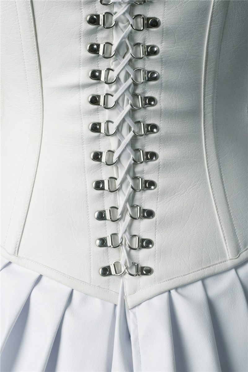 紧身胸衣的缝线,从腰际向胸部呈扇形展开,即使大幅度的动作,也不会让衣服走形。胸衣前部插入鲸骨或木片、金属薄片定型来保证腹部平坦,胸衣背后的鲸须压迫肩胛骨,让胸部更突出。胸衣开口在后方,腰围越来越小。胸衣前部下端呈尖角状,在视觉上产生腰身看上去更苗条的效果。