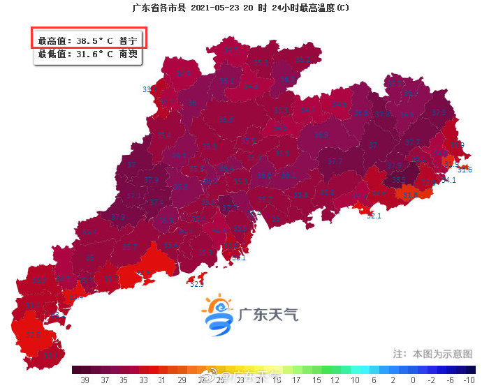 其中云浮、郁南、增城、高要、河源、罗定、德庆、紫金、顺德这9个市县,甚至打破或持平了当地5月高温历史极值纪录,23日全省最高温为普宁的38.5℃。