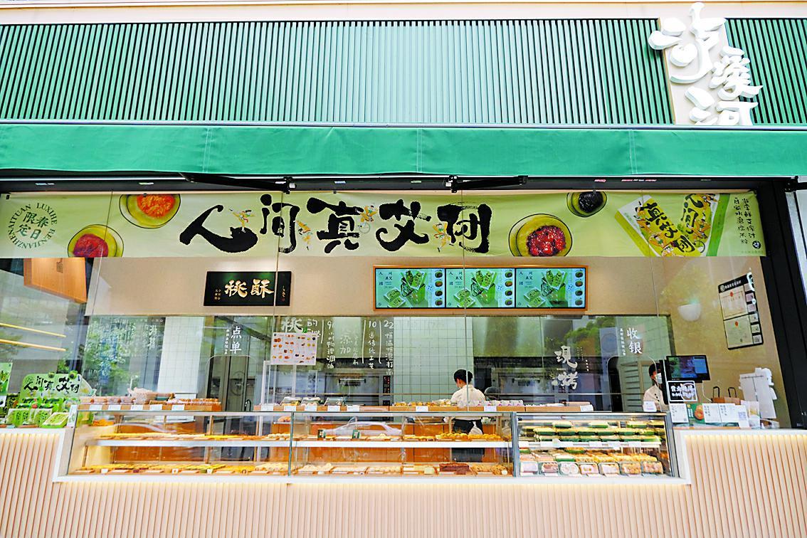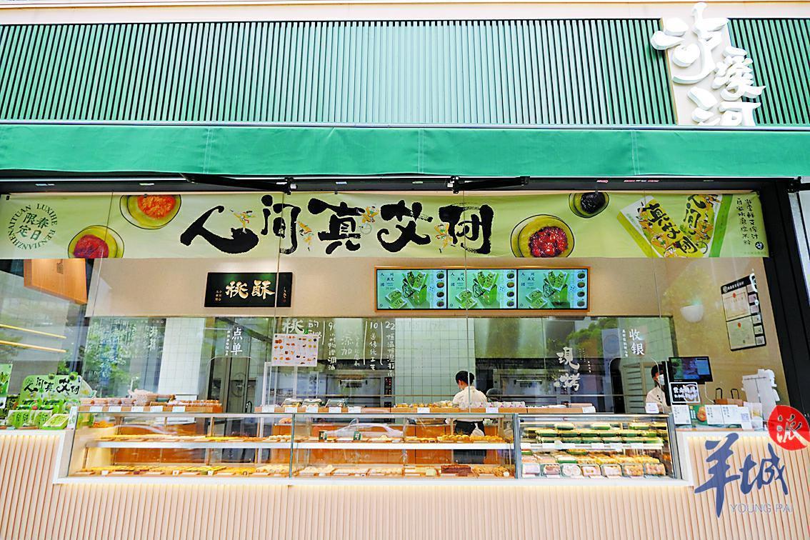 羊城晚报记者日前来到位于地铁口附近的泸溪河石牌桥店,这里的店面装潢以绿白两色为主,颇具传统特色。顾客们可从店外透过玻璃看到点心师傅们现场制作糕点,这种“透明厨房”正是泸溪河的卖点之一。泸溪河点心号称“每日现烤”和“纯天然无添加”,据了解,现场除冰糕类产品是非现烤以外,摆在货台上的蛋挞、枣糕、榴莲酥等都是新鲜现烤的产品。临近清明节,泸溪河还应景地推出了“春日限定”新品——“人间真艾团”。