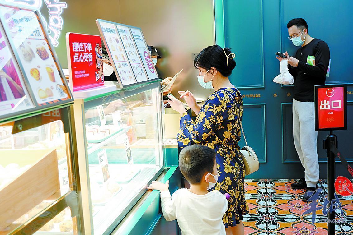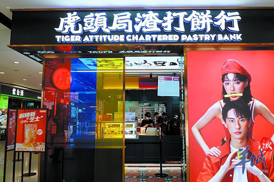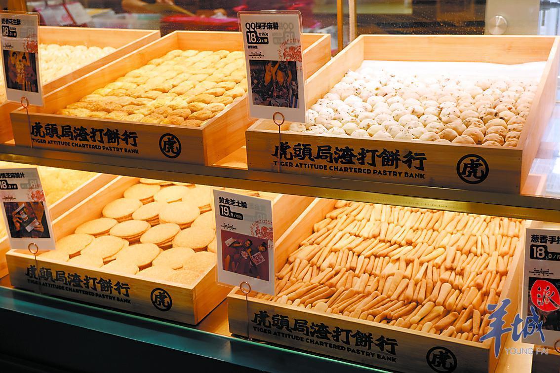 日前,记者走进位于花城汇的虎头局渣打饼行,这家诞生于长沙的网红点心店,装潢复古醒目,带有浓厚的国潮风。店内的“镇店头牌”——双层麻薯盘挞、QQ提子麻薯、拉丝麻薯蛋挞等“麻薯家族成员”整整齐齐地摆在显眼位置,吸引了不少消费者前来选购。短短一个小时内,柜台上的热门产品老婆饼、泡芙、盘挞等就已经售出了大半。