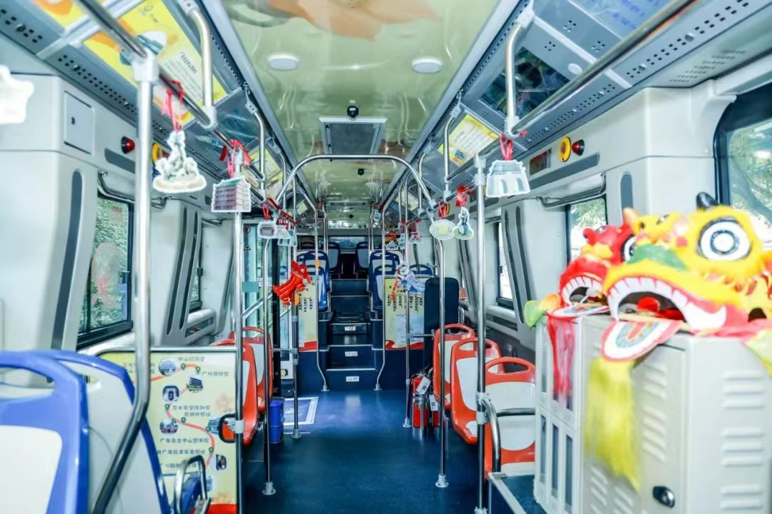 车身上方的“读城 | 乘坐公交博物馆专线,读懂广州千年文明史”主题字样鲜明突出;醒狮、博物馆藏品卡片、窗花等独具特色的博物馆文化元素将车厢内装饰一新;车厢内的电子屏幕展示着途经博物馆的风采和文物,公交车变身为“移动博物馆”的城市移动文化地标。
