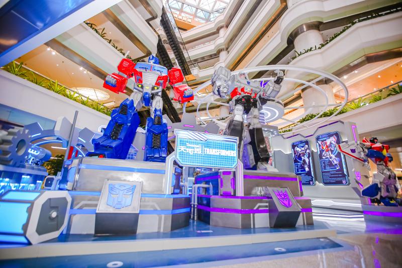 步入广州天河城一楼中庭,塞伯坦星球雏形初现,核心作战指挥室与象征着正义汽车人的蓝色能量区域吸人眼球。