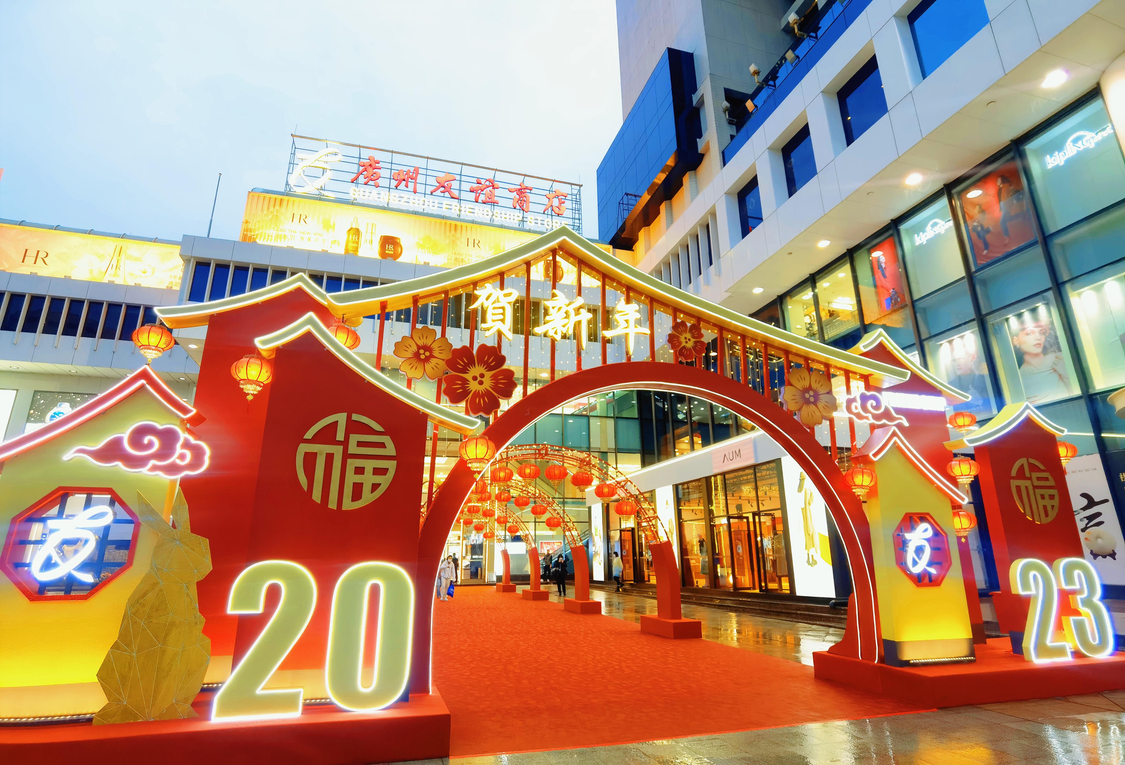 据介绍,在北京路商圈,广百百货设置巨型“兔爷”主题景观文创为新年造势,传统与时尚风潮融合,以“2023 LUCKY兔 U”为主题开展全品类折扣促销,广百荟线上年货大力度打折。北京路天河城推出5周年庆暨“爱购节”大型促销活动,并联合中国银联云闪付平台,开展岁末购物优惠,打造线上+线下双线驱动的消费氛围。