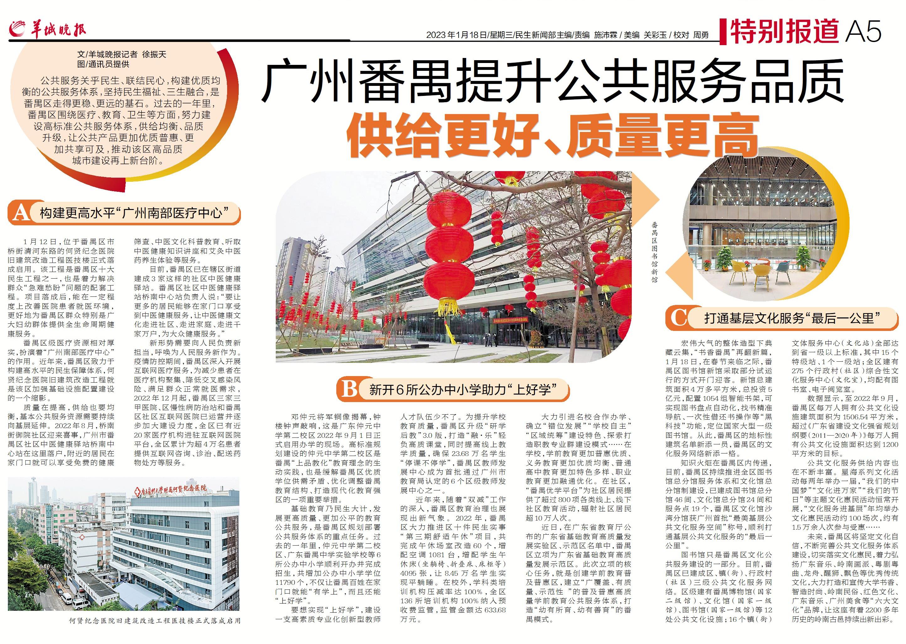 公共服务关乎民生、联结民心,构建优质均衡的公共服务体系,坚持民生福祉、三生融合,是番禺区走得更稳、更远的基石。过去的一年里,番禺区围绕医疗、教育、卫生等方面,努力建设高标准公共服务体系,供给均衡、品质升级,让公共产品更加优质普惠、更加共享可及,推动该区高品质城市建设再上新台阶。