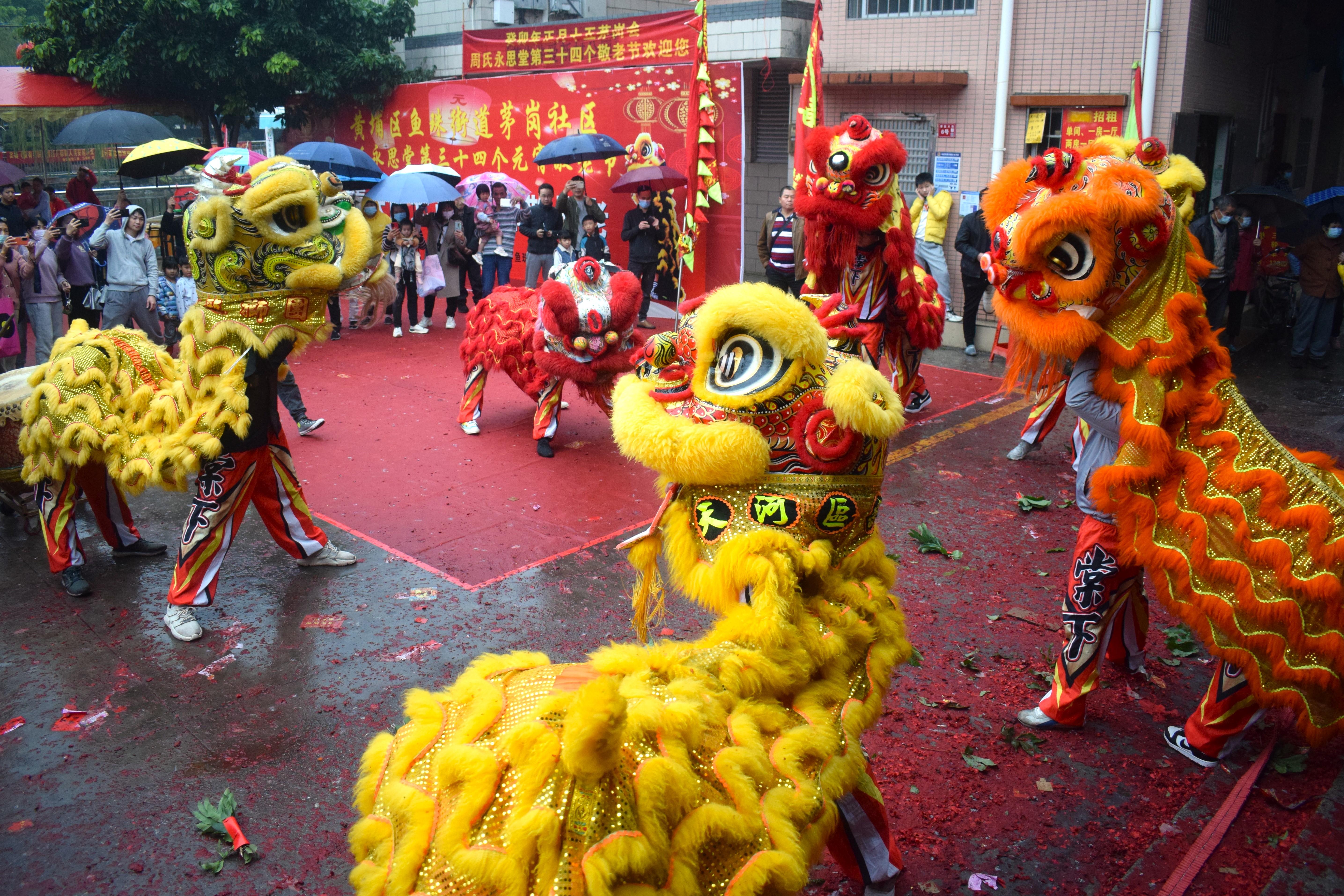 威风凛凛醒狮送福,鞭炮声声恭贺元宵。2月5日,广州市黄埔区茅岗社区复办具有百年历史的传统文化活动“茅岗会”与第三十四个元宵敬老节。当天上午,茅岗社区远近各村20余支狮队、近百头醒狮纷纷到此贺岁、采青。
