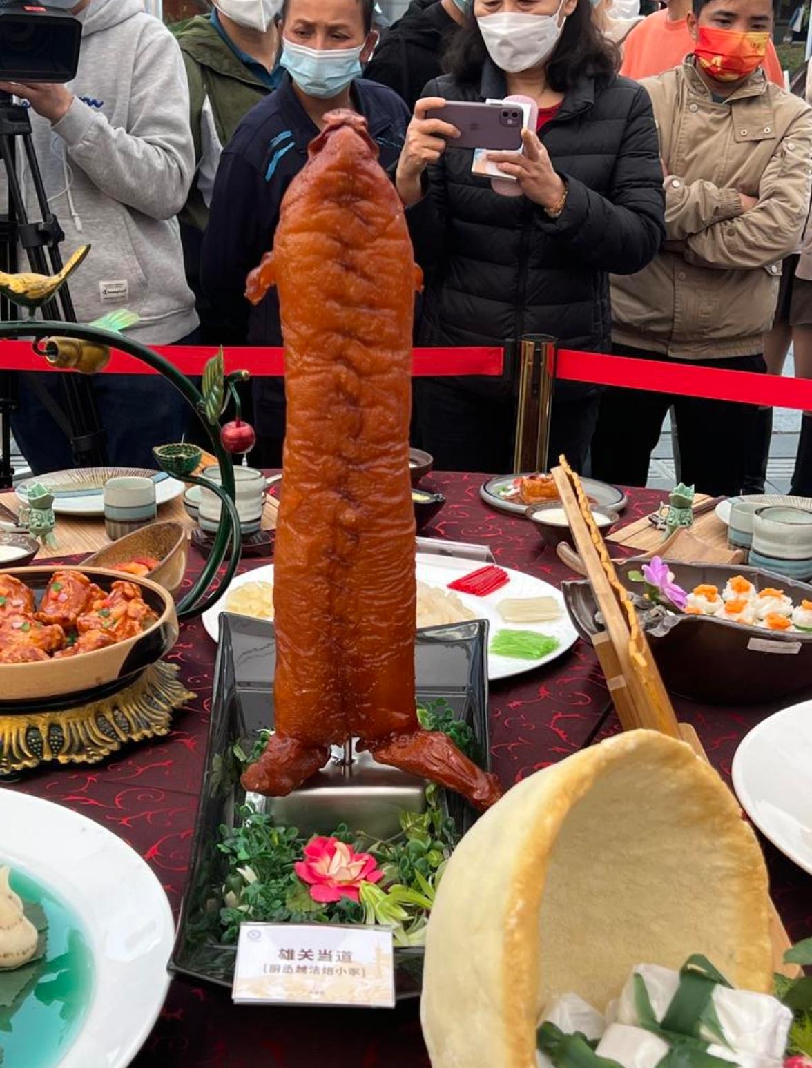 麦展飞更笑称,现场最特别值得一提的是其中一道叫“雄关当道”的菜式,是“世界上第一只站立起来的烤乳猪”,形神兼备,厨师功夫尽显其中。