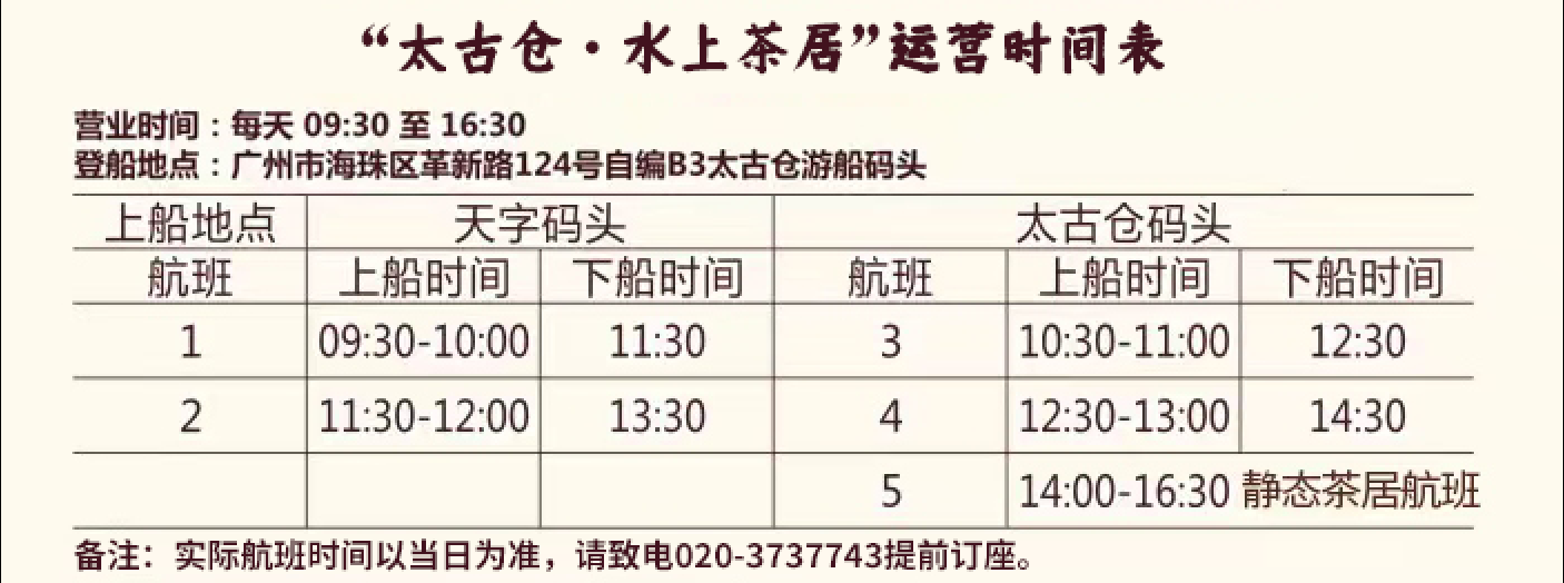 “游船每天在天字码头和太古仓码头之间来回航行,码头之间的航行时间和码头候泊时间为半个小时,14时之后游船会静态停泊在太古仓码头。”广州太古仓码头游艇发展有限公司总经理、广州金航游轮股份有限公司副总经理黄时桥介绍,在“太古仓·水上茶居”新航线上,市民游客会领略到沿途的地标建筑,如人民桥、沙面、白天鹅宾馆、百年太古仓码头等。