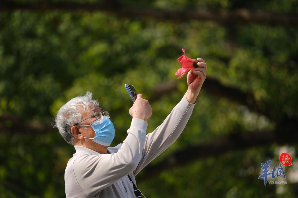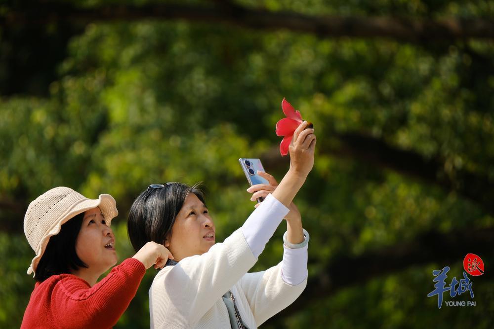 五星红旗随着微风飘扬,走过烈士陵园红色主色调的正门门楼,穿过陵墓大道,广州起义纪念碑庄严矗立,右侧的木棉树坚守在纪念碑一侧,守护着广州起义烈士之魂,开出的鲜红色花蕾,犹如烈士的鲜血。春日暖阳洒在广州起义纪念碑的一砖一石上,红棉点缀,纪念碑英雄之气尽显。