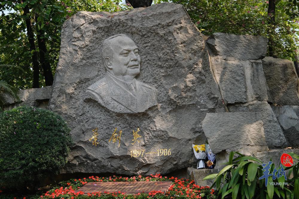 以青灰色花岗岩石雕琢的叶剑英同志纪念碑,高4.6米,碑上雕刻着叶剑英身穿元帅服的半身浮雕,邓小平亲笔题写的“叶剑英”三个大字醒目、清晰。英雄花开之时,前往瞻仰叶剑英同志纪念碑的市民默默放下手中的花束,先烈形象永存市民心中。