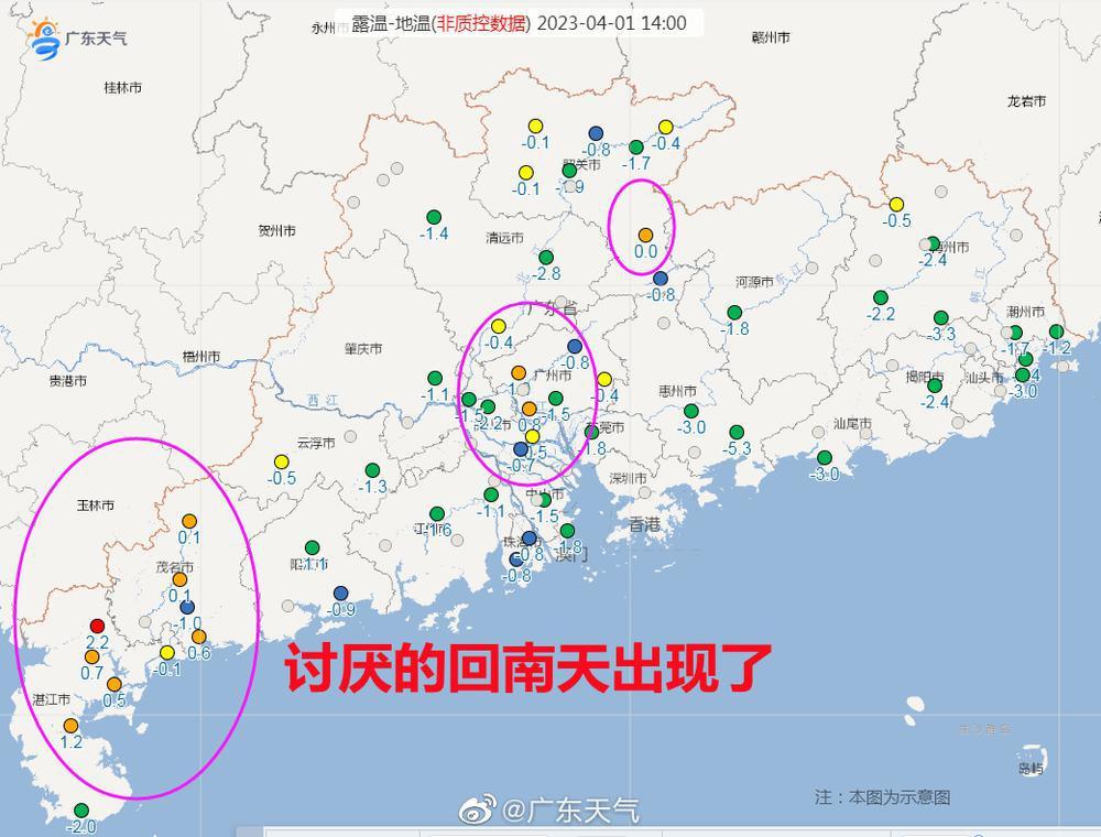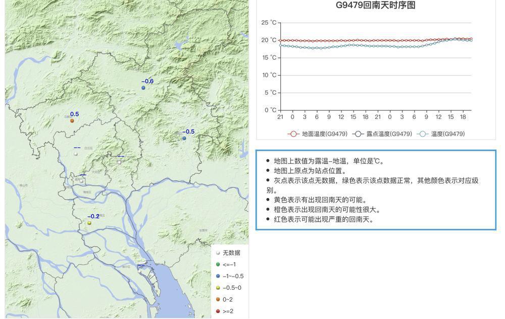 在广州,截至4月1日20时,位于白云区的“回南天”自动监测气象站录得数据0.5,表示“‘回南天’可能性很大”;位于番禺区的“回南天”自动监测气象站录得数据-0.2,表示“有出现‘回南天’的可能”。