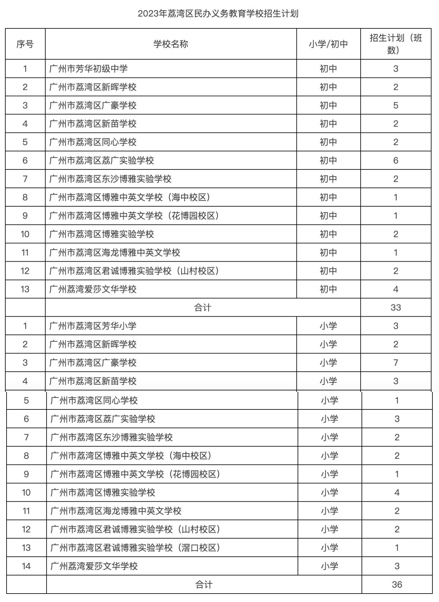 4月28日,广州市荔湾区教育局发布《2023年荔湾区民办义务教育学校招生工作方案》(以下简称《方案》)。根据《方案》所示,2023年荔湾区民办小学计划招生班数共36个,民办初中计划招生班数共33个。