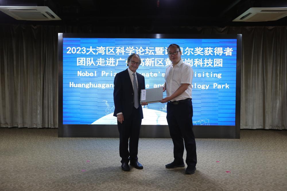 当天,诺贝尔奖获得者及团队参观了中山大学附属肿瘤医院,并在黄花岗科技园创意大道园区见证了越秀生命健康产业人才会客厅揭牌,越秀区委组织部在活动上为迈克尔·莱维特 (Michael Levitt)教授赠送《越秀新彩》画卷。据介绍,越秀生命健康产业人才会客厅将引入人才服务机构提供人才“产学研用”全链条服务和投融资支持,致力吸引海内外人才带项目在越秀成果转化落地。