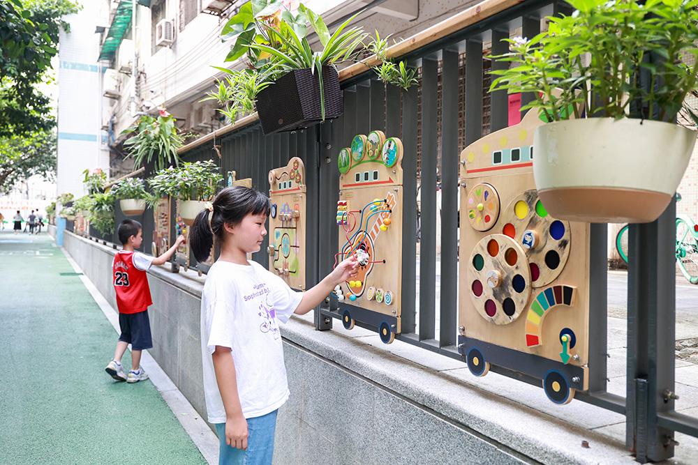 越秀区寸土寸金,白云街道工作人员介绍,通过不断摸查社区的“边角位”,努力为孩子们寻找更多可用空间。比如,打造廊架下的活动场;充分利用居民楼栋之间废弃的灰色空间,通过新增遮蔽廊架及滑梯、爬架等儿童喜爱的游玩设施,打造晴雨两用的儿童户外活动空间,打造放学路上的跑道乐园。