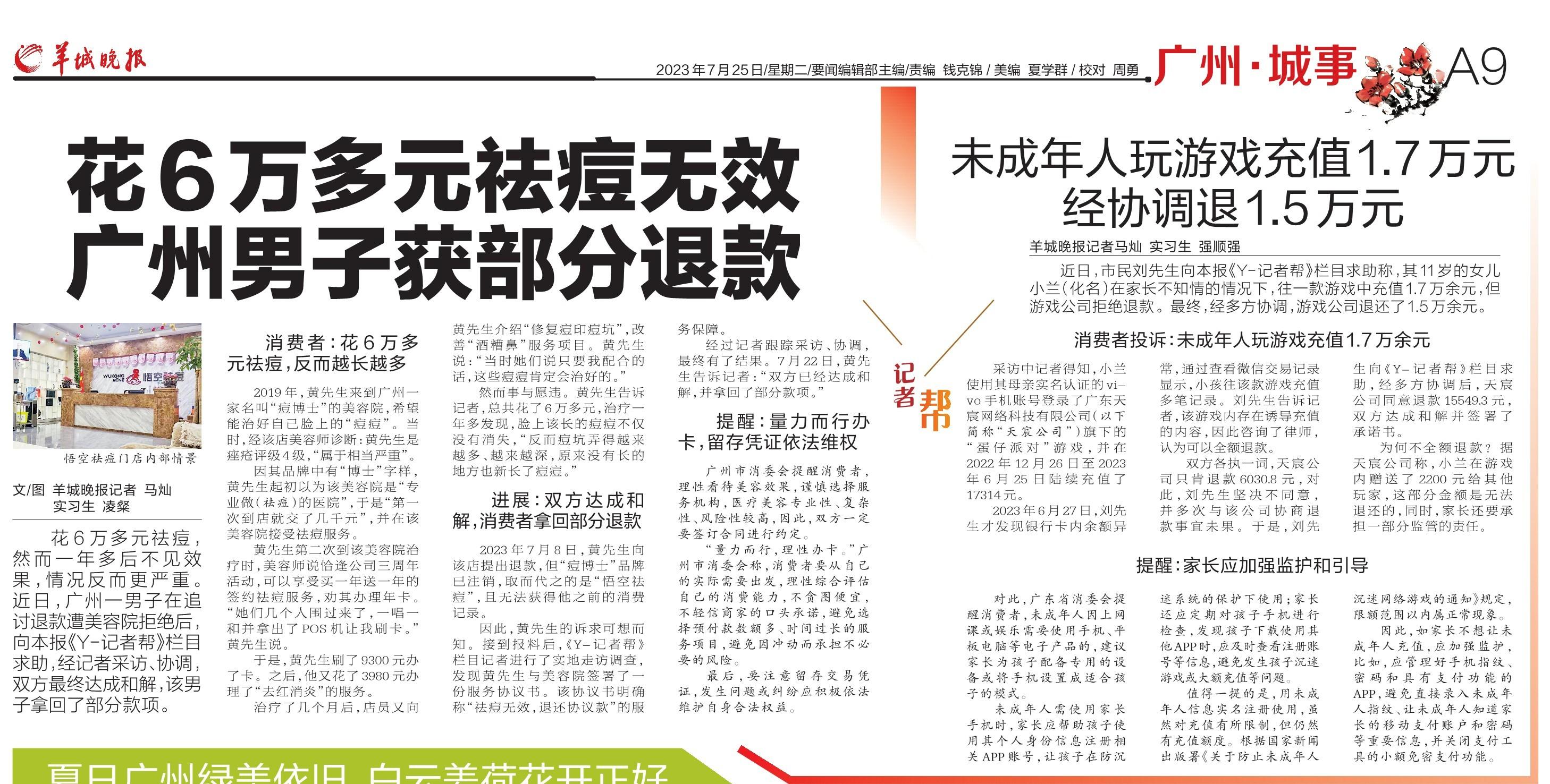 花6万多元祛痘,然而一年多后不见效果,情况反而更严重。近日,广州一男子在追讨退款遭美容院拒绝后,向羊城晚报《Y-记者帮》栏目求助,经记者采访、协调,双方最终达成和解,该男子拿回了部分款项。
