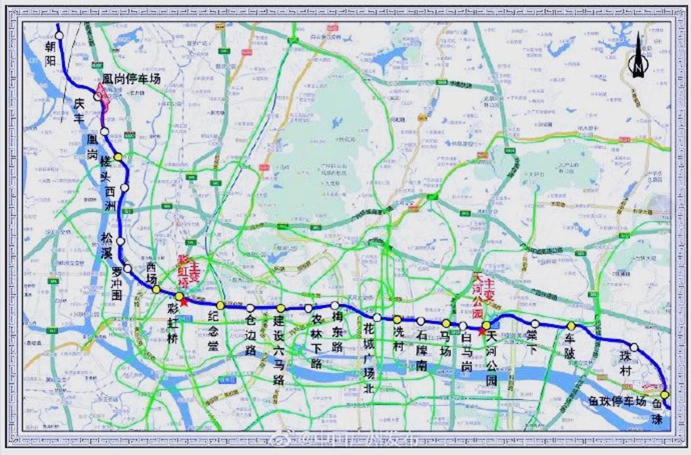 地铁13号线二期东起首期黄埔区鱼珠站,西至白云区朝阳站,大致呈东西走向,途经黄埔区、天河区、越秀区、荔湾区和白云区。