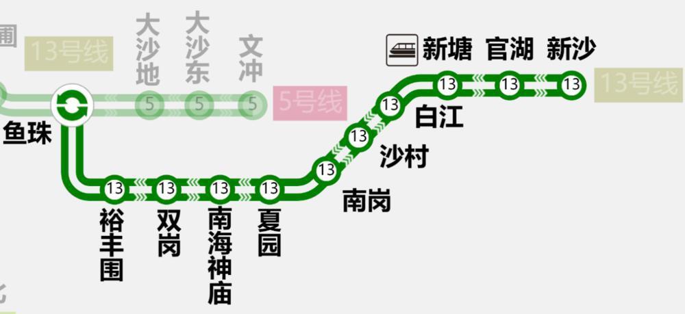 地铁13号线首期西起黄埔区鱼珠站,东至增城区新沙站。其中,在增城设沙村站、白江站、新塘站、官湖站、新沙站。
