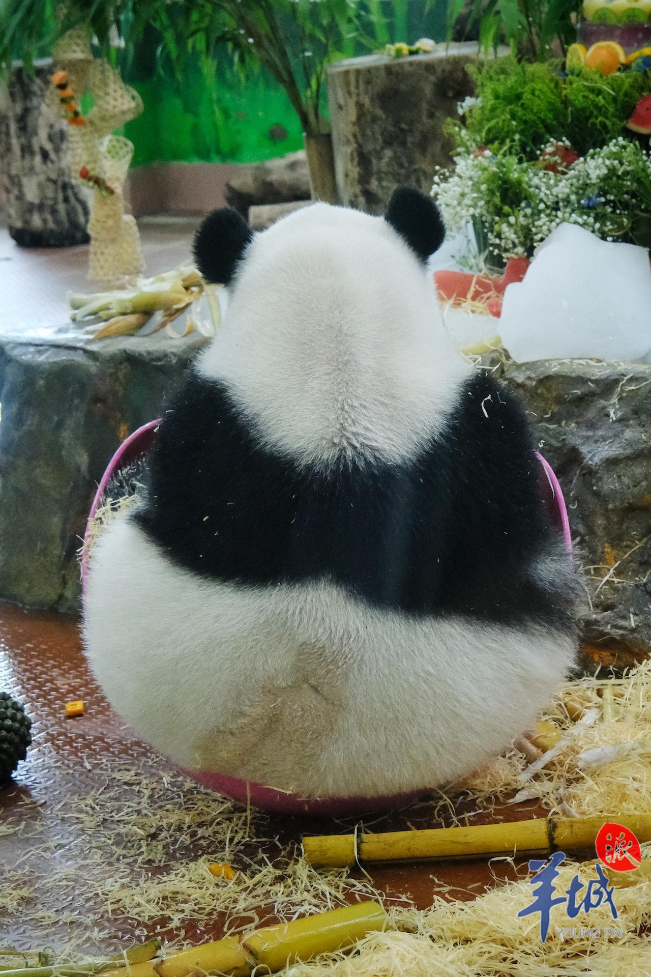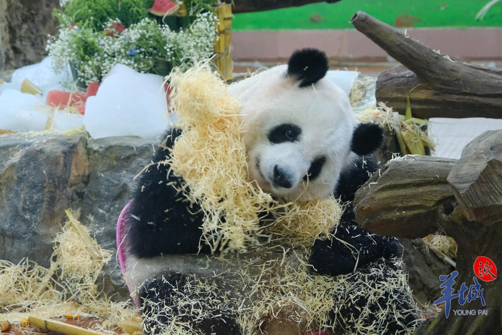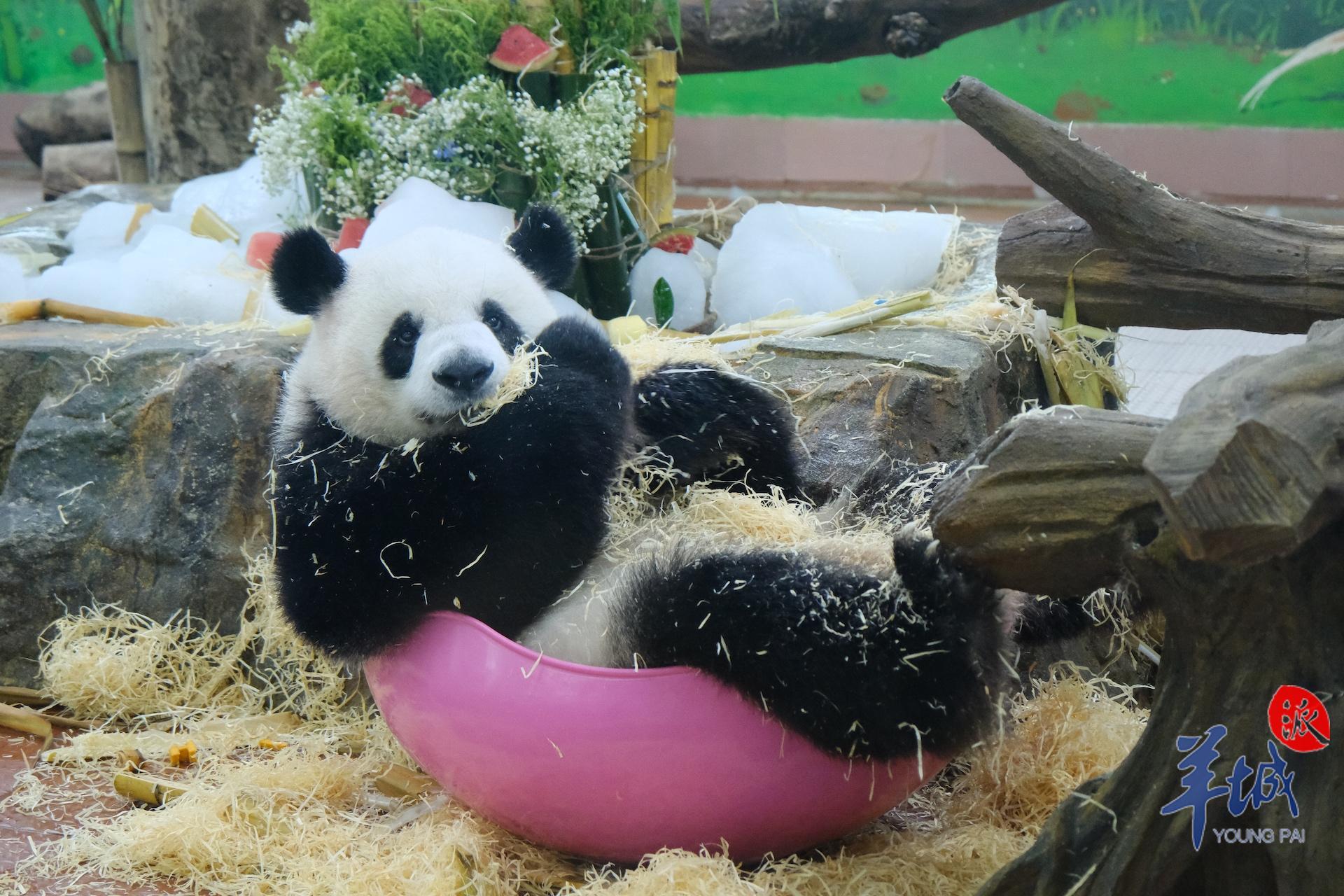 8时40分,“雅一”出现,看到生日大餐,它先是淡定地用刨花丝“洗脸”,然后优哉游哉地整理了一下冰块,再品尝起竹叶。9时左右,“星一”也来上班了,和“雅一”不同的是,它先品尝了早餐竹笋。