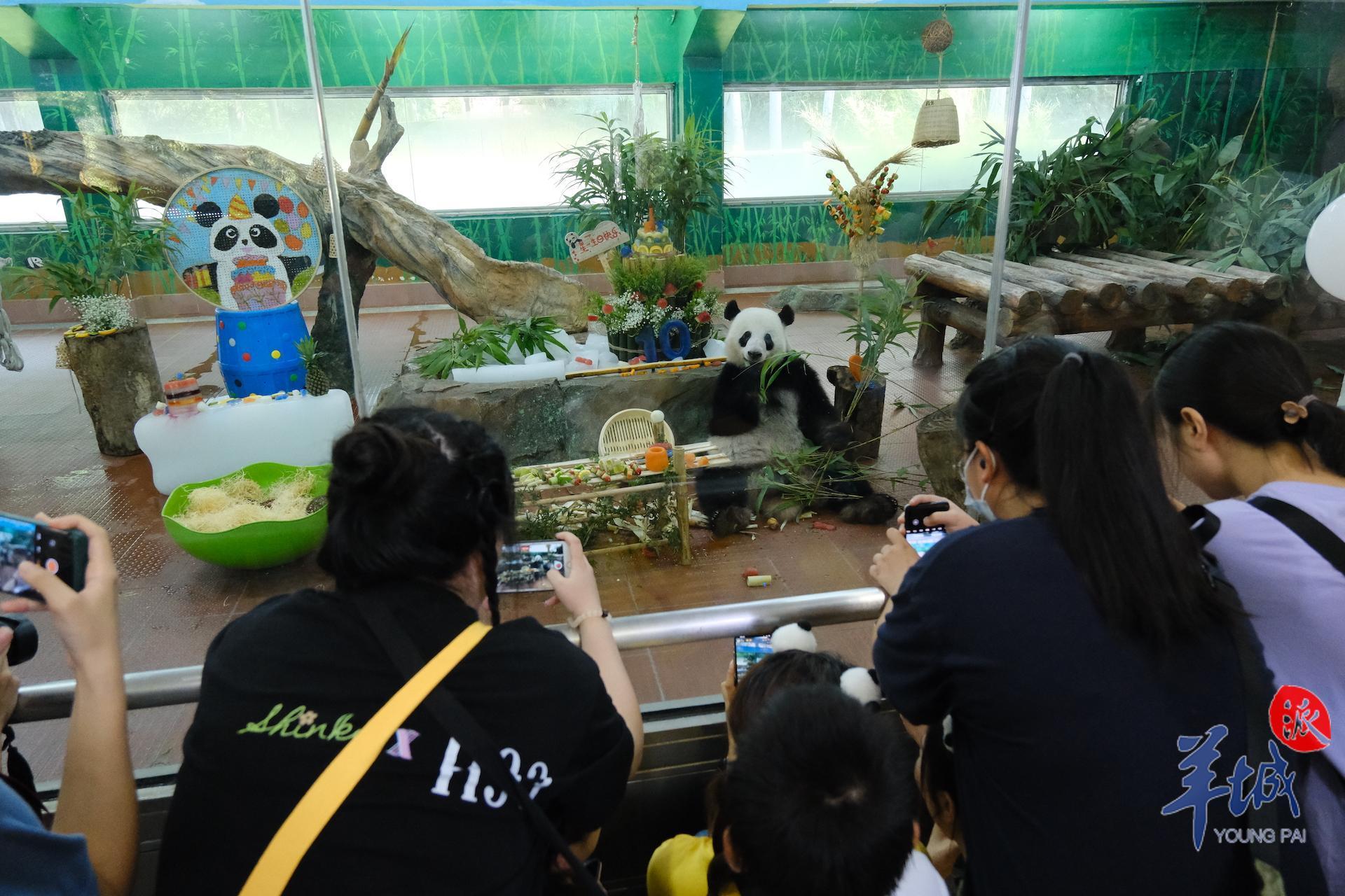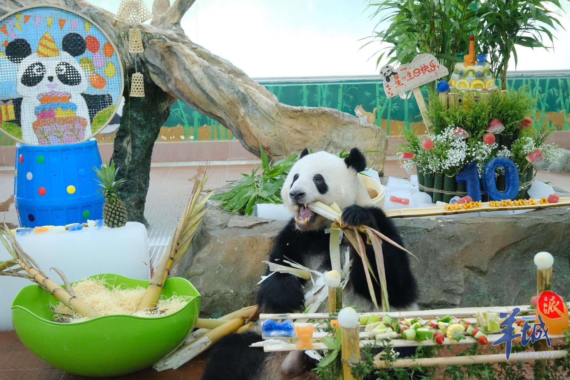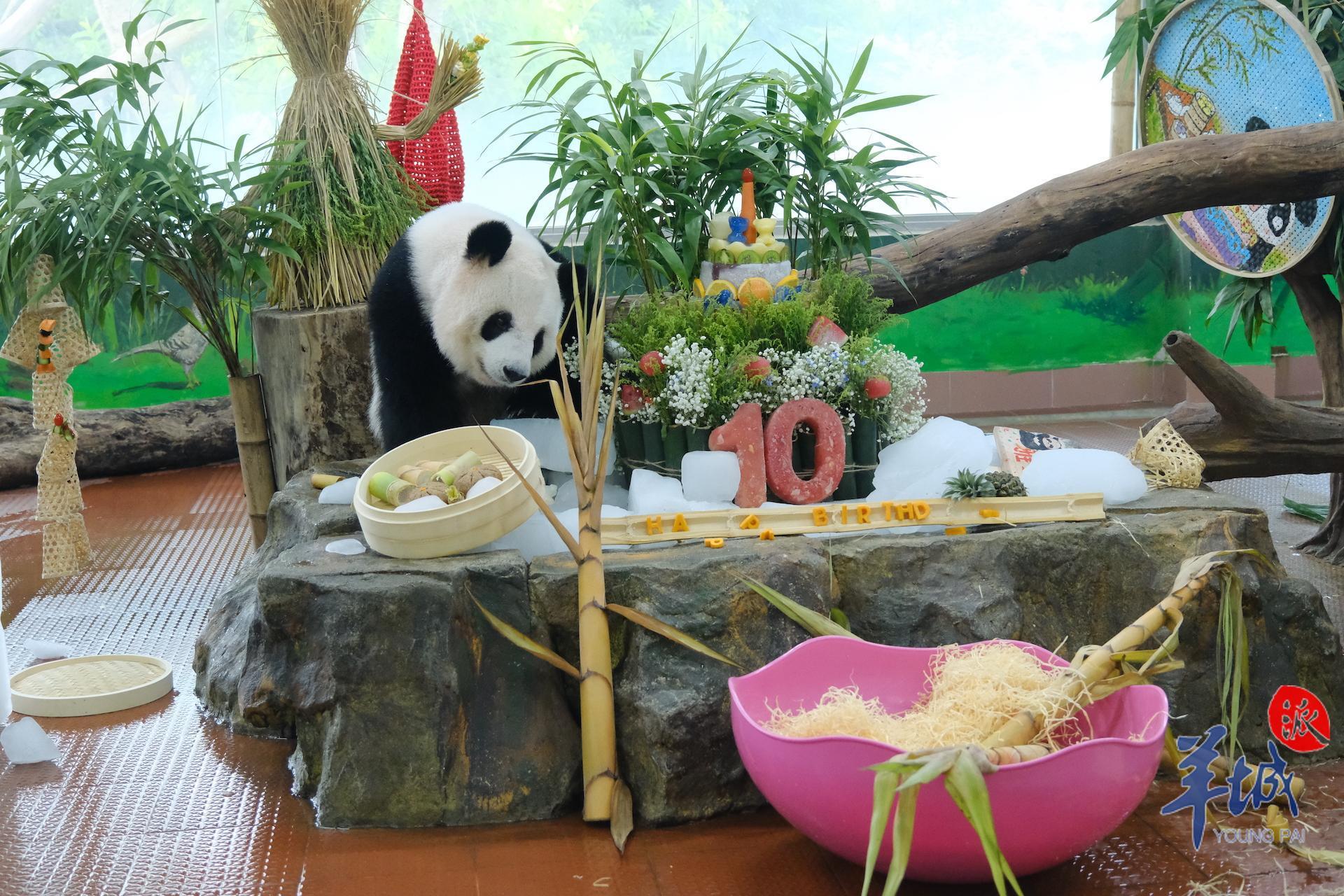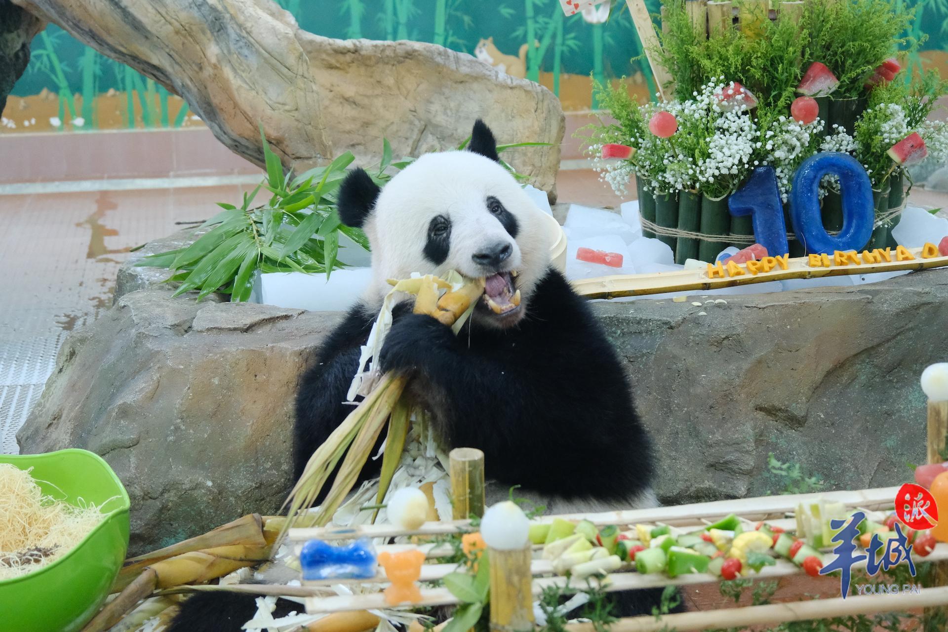 早上8时左右,“奶爸奶妈”已在为大熊猫布置生日会。羊城晚报记者在现场看到,豪华生日餐十分吸睛,除了有竹叶竹笼装着的窝窝头、竹笋等“一盅两件”,还有由水果泥制成的水果冰蛋糕,生日蛋糕前的数字“10”十分显眼。