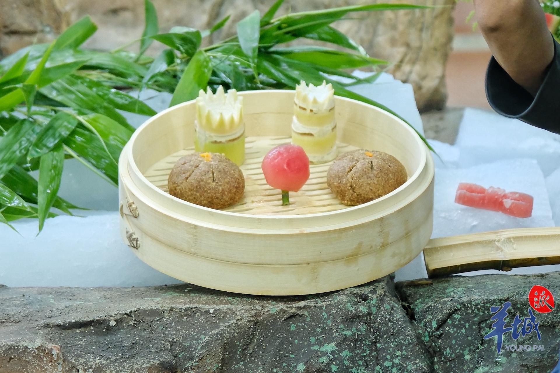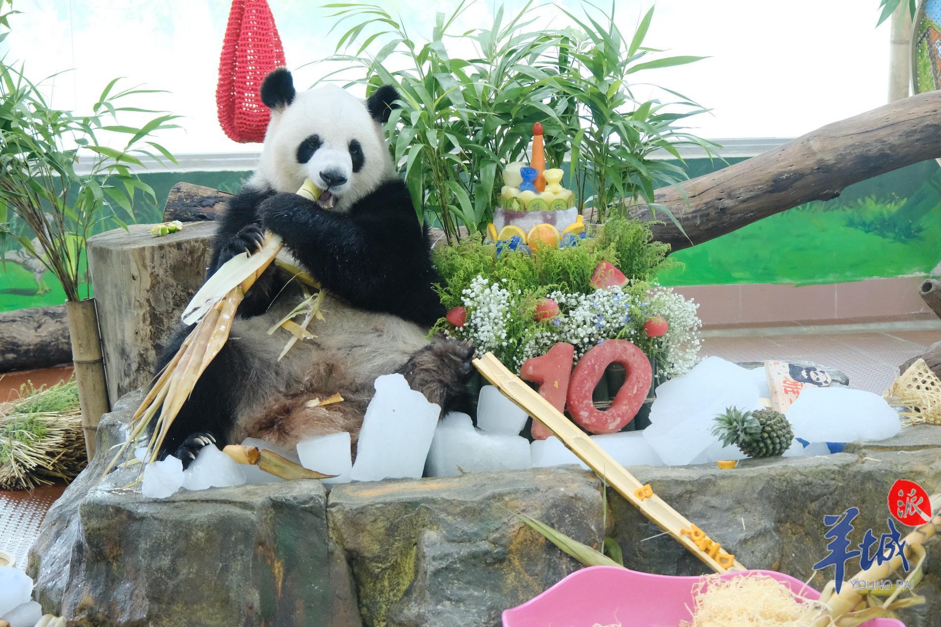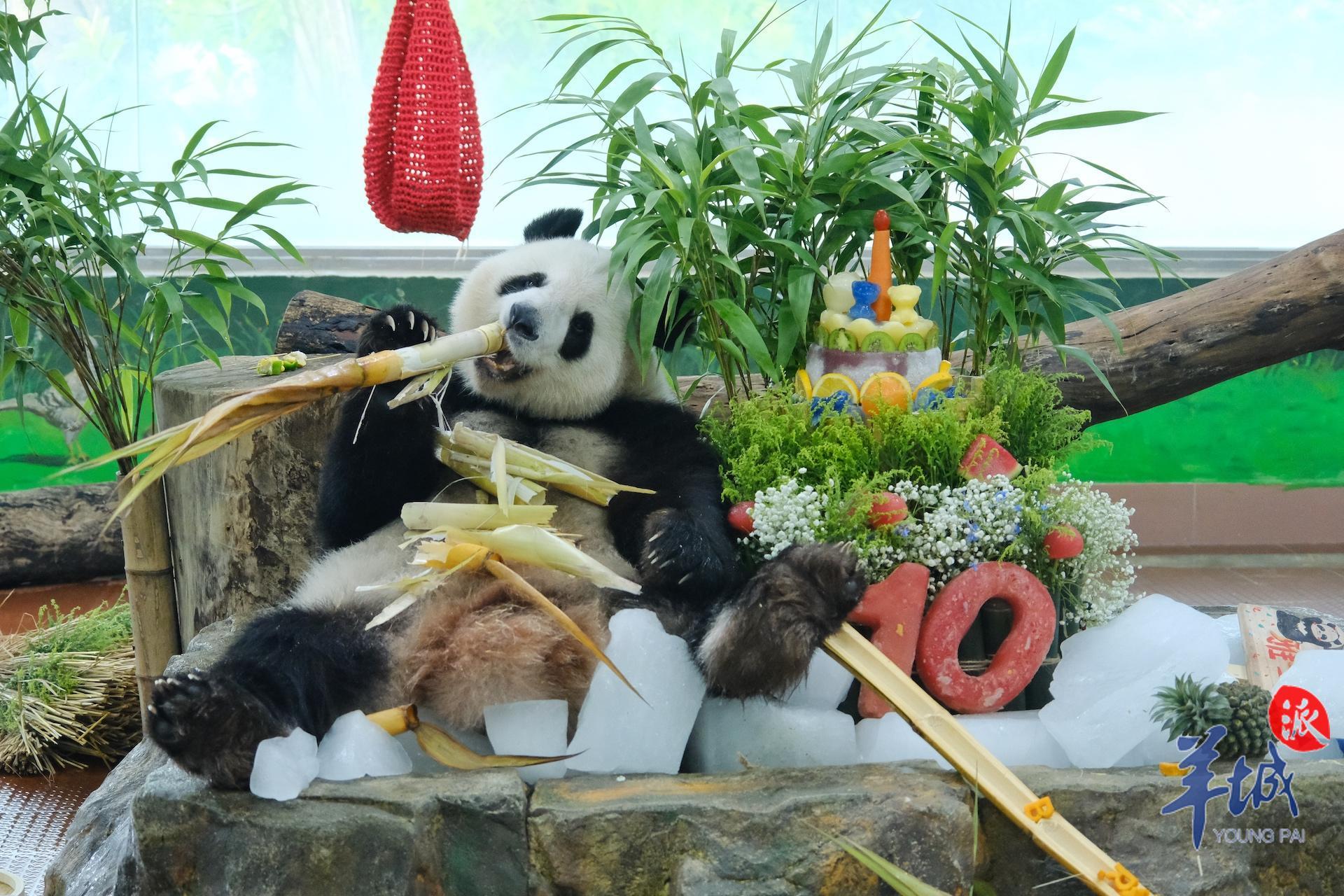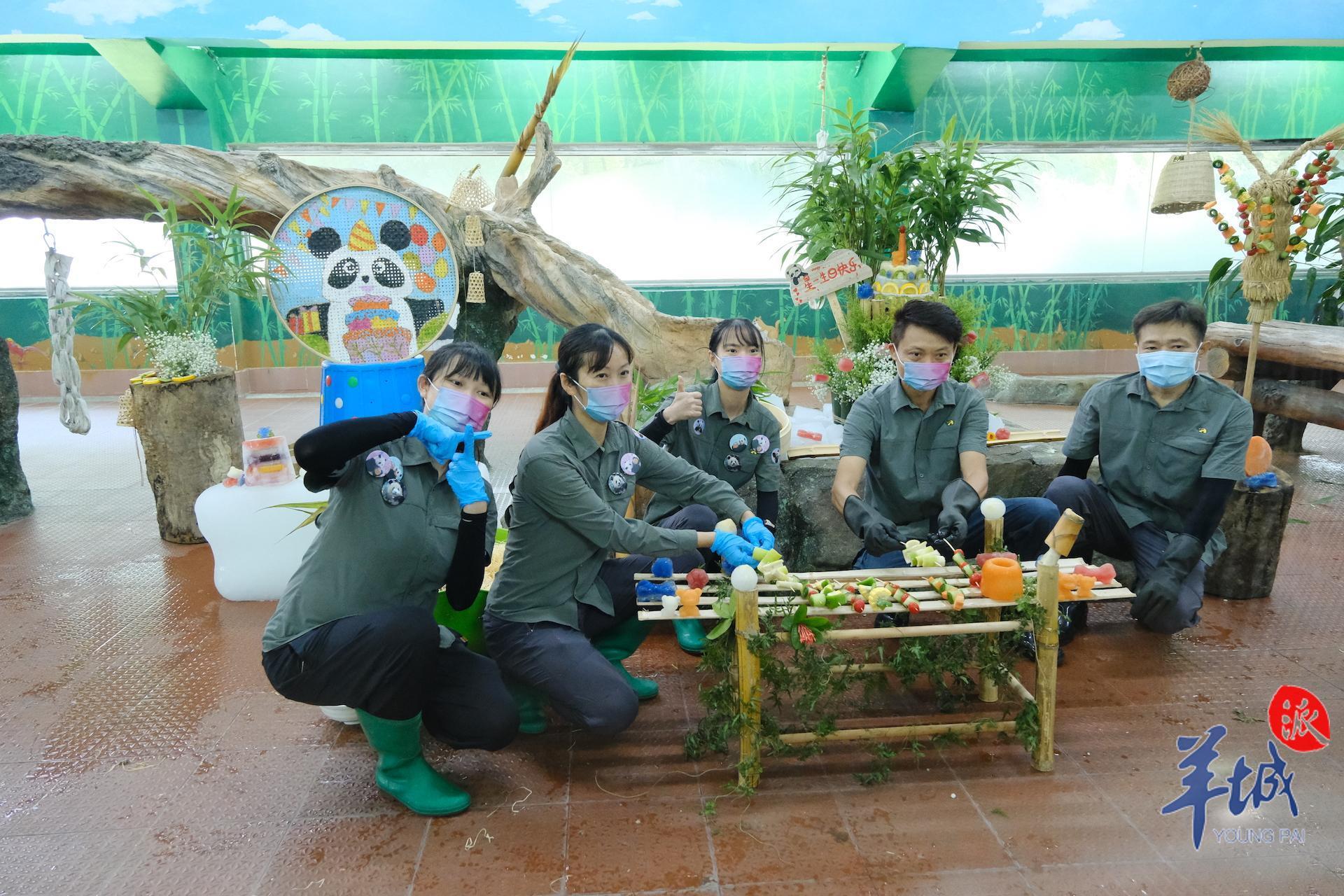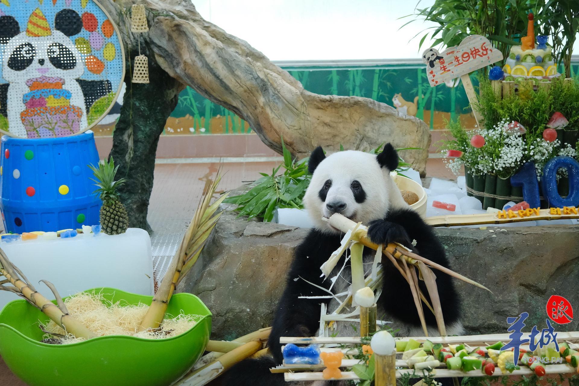 早上8时左右,“奶爸奶妈”已在为大熊猫布置生日会。羊城晚报记者在现场看到,豪华生日餐十分吸睛,除了有竹叶竹笼装着的窝窝头、竹笋等“一盅两件”,还有由水果泥制成的水果冰蛋糕,生日蛋糕前的数字“10”十分显眼。