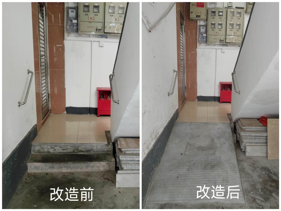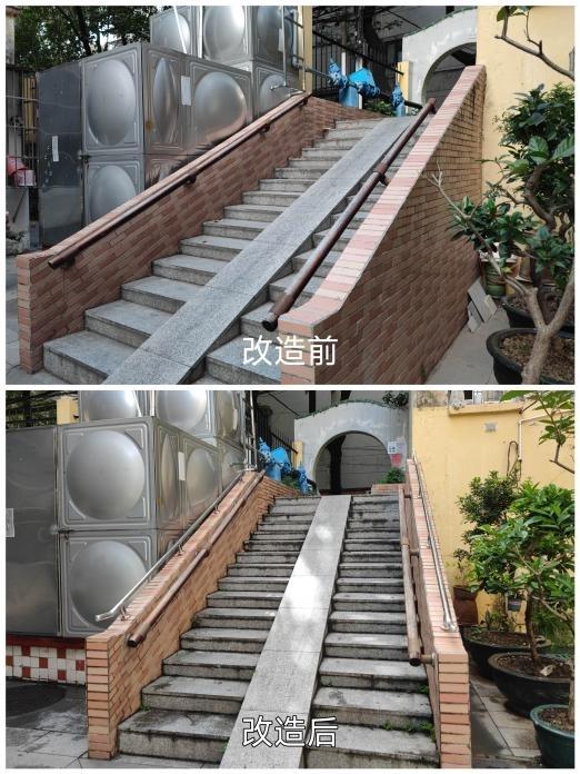 改造过程中,社工们通过链接广州市农林街社区慈善基金资源,组织专业团队进行尺寸度量与现场施工,最终采取铺水泥的方式将台阶改造成坡道,为楼梯加装了不锈钢扶手。轮椅用户及社区长者可以轻松地出入社区,与其他居民一样享受美好的社区生活。