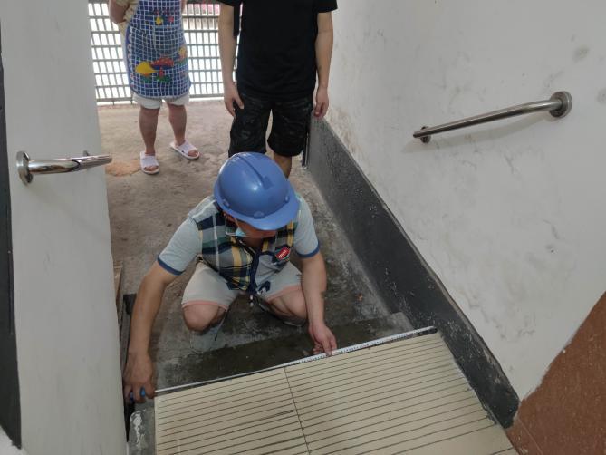 社工们介绍,此前在社区走访时发现一户特别的长者家庭,雷姨(化名)是社区年近八旬长者,由于老伴中风、行动不便,每周需要推老伴去医院康复理疗,虽然雷姨只是住在一楼,但是短短两级台阶就把雷姨“难倒了、累哭了”。