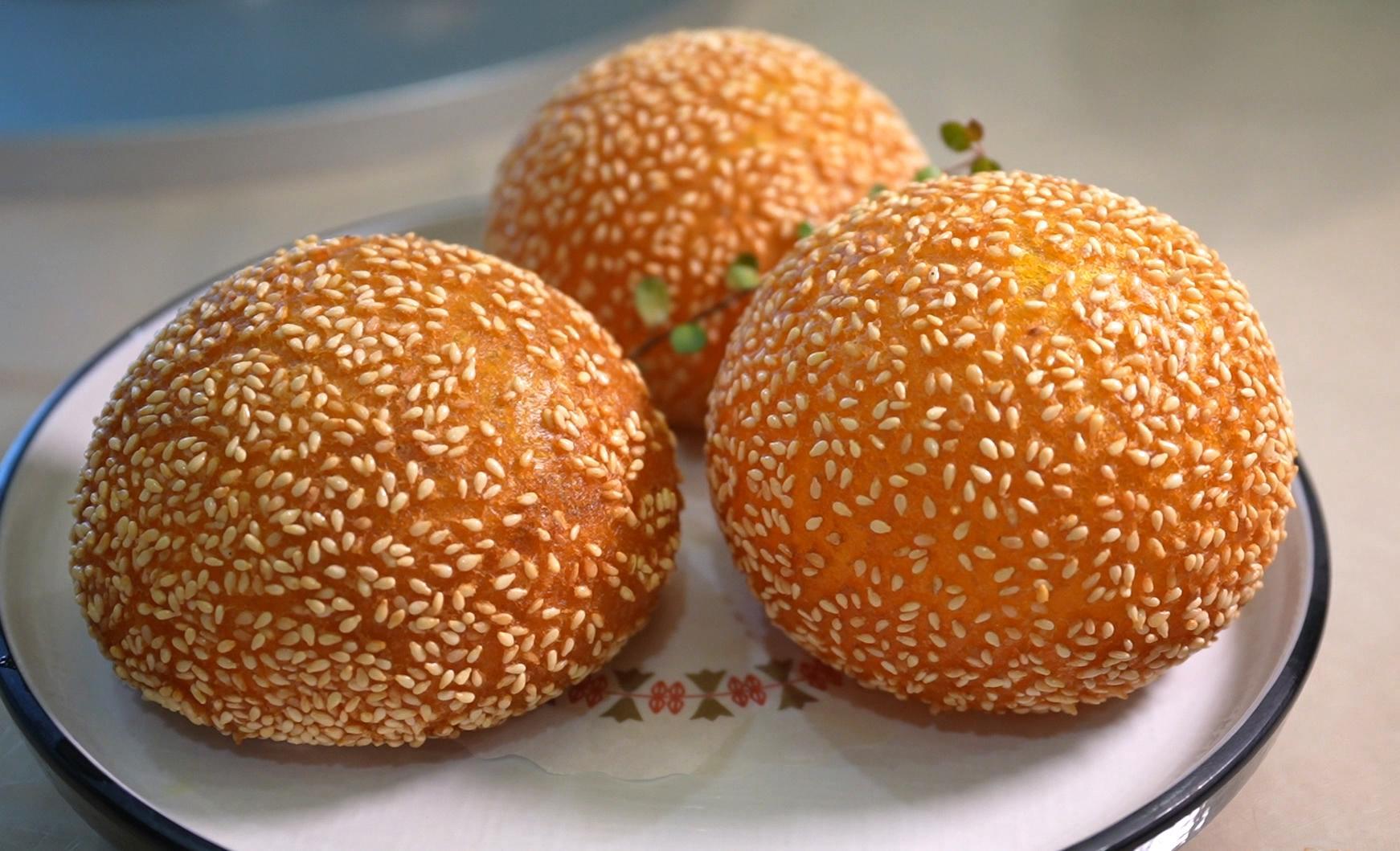 拳头大小的煎堆浑圆中空,金黄表皮薄脆清香,南瓜馅料香甜可口。