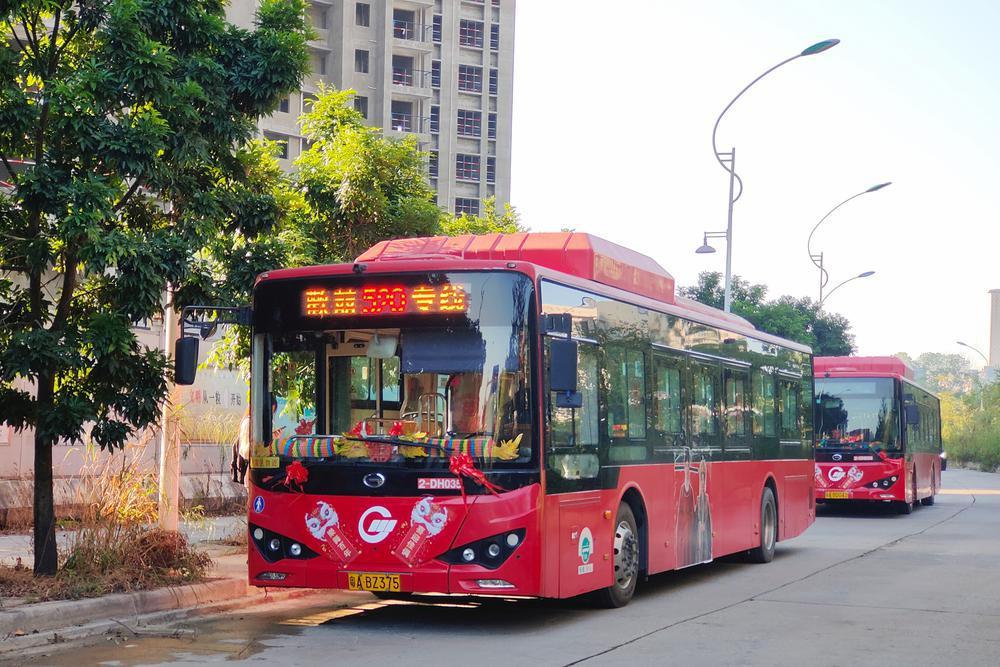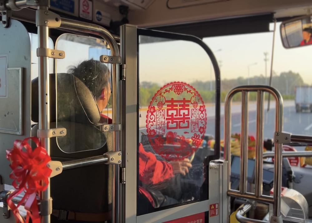 11月21日清晨,两辆“盛装打扮”的巴士婚车从广州市白云区泽德花苑公交总站缓缓发出。与往日广州公交车的“满洲窗”外观涂装不同,两辆巴士婚车别出心裁地进行了喜庆装饰:车头播放“520欢喜专线”专属显示屏,挡风玻璃两侧放置五彩金龙,车身两侧分别展示一对新人的西式以及中式婚纱照,“双喜”窗花配上大红车身,行驶在路上喜气洋洋,格外引人注目。
