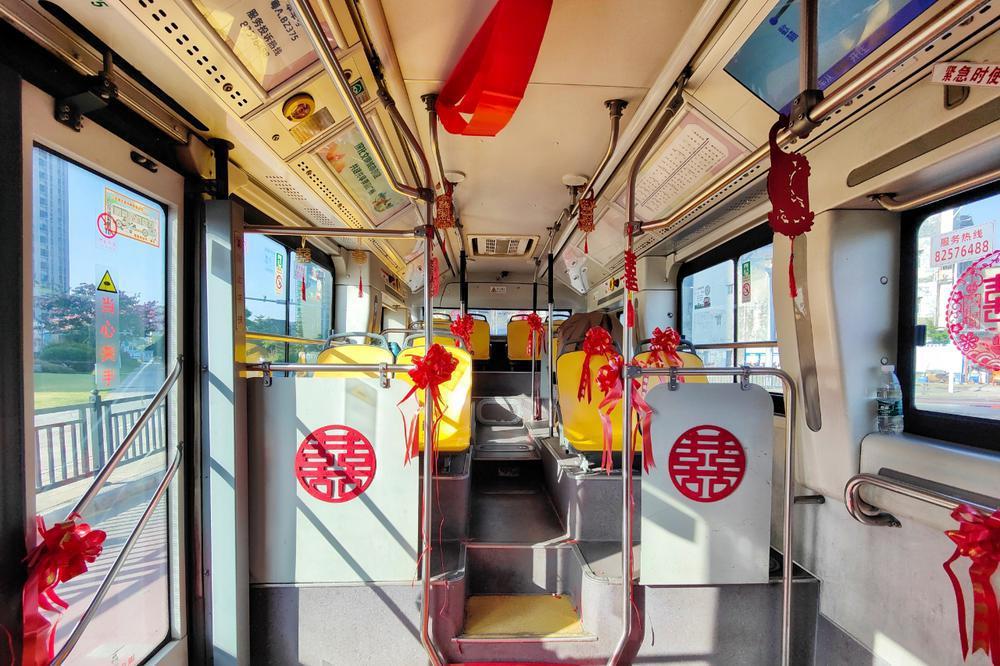 记者了解到,本次服务新人的两台车辆均是K9纯电动公交,车内配置22个座位,加上站的空间大,足够一众亲朋好友搭乘,让两人的结亲之旅,变成新人和家人朋友的一路同行。