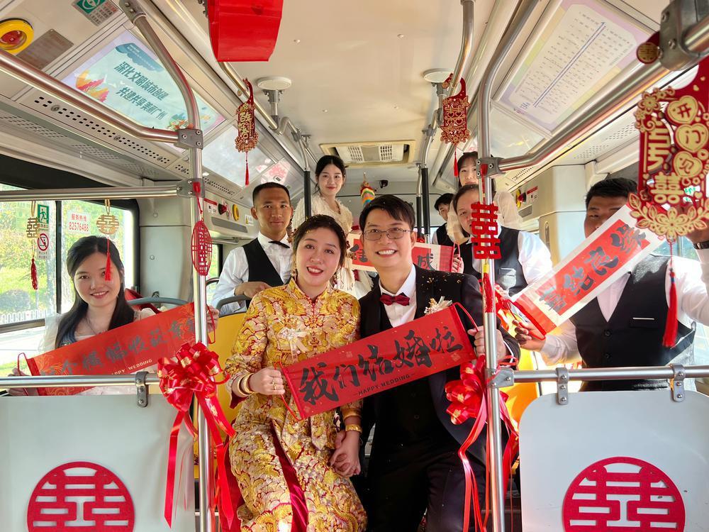 为什么选择巴士作为迎亲婚车?新郎毕先生表示:“通过某社交平台我们看到有租巴士车迎亲的,觉得很新鲜,便联系了巴士公司。巴士婚车相比传统小车车队,价格上也会经济实惠些,容载量大,一台车就可以搞定迎亲环节,不用再考虑婚车数量、车辆安排等让人头疼的问题,配有专属的司机,安全又实用。”