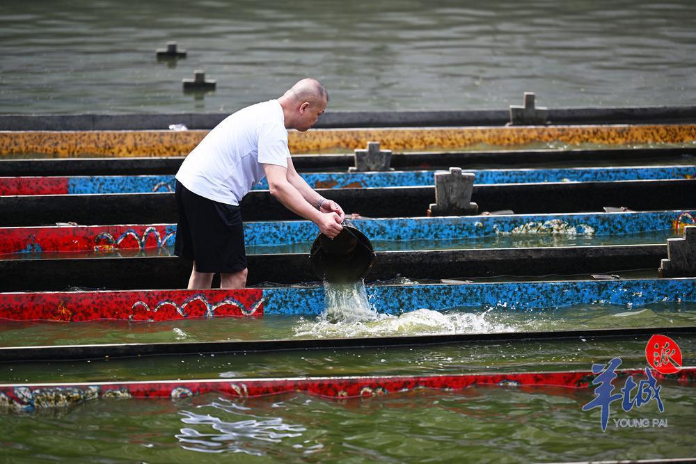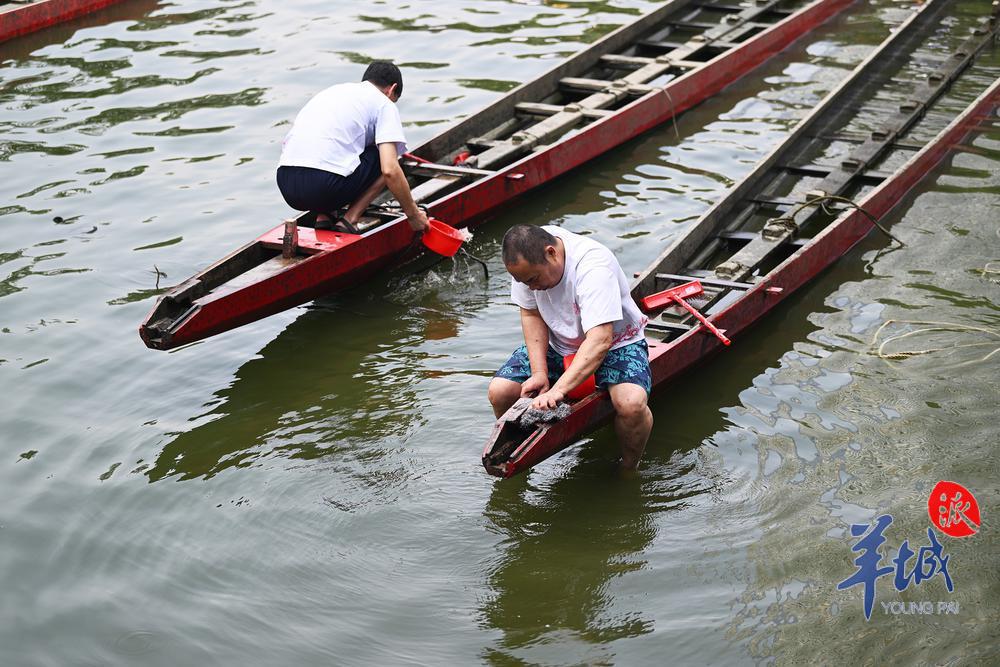 其实早在两天前,村里就已提前开闸放水。仪式现场,只见藏龙塘上龙舟整齐排列,露出船头船尾,数名青壮年正对船身进行清洗。