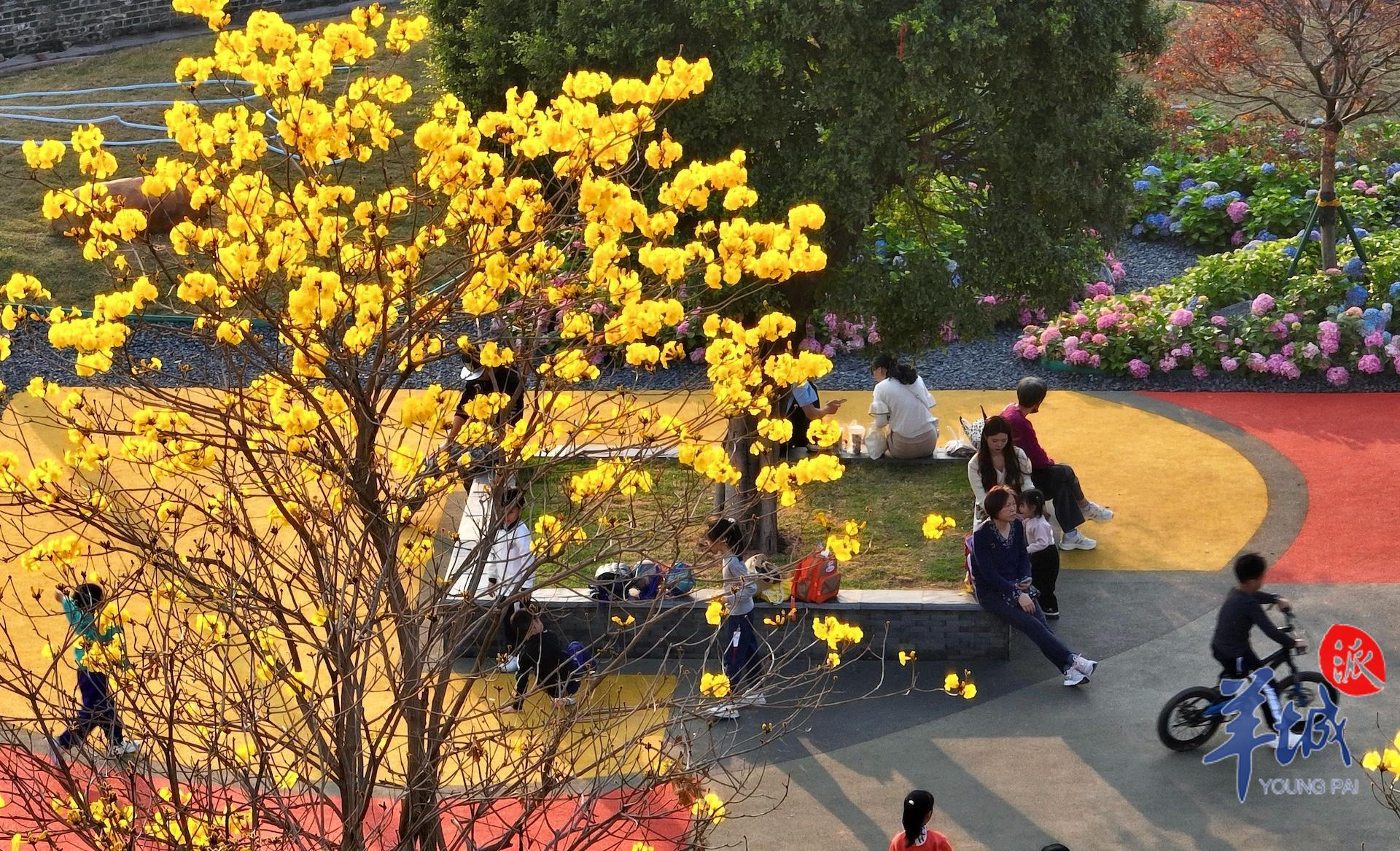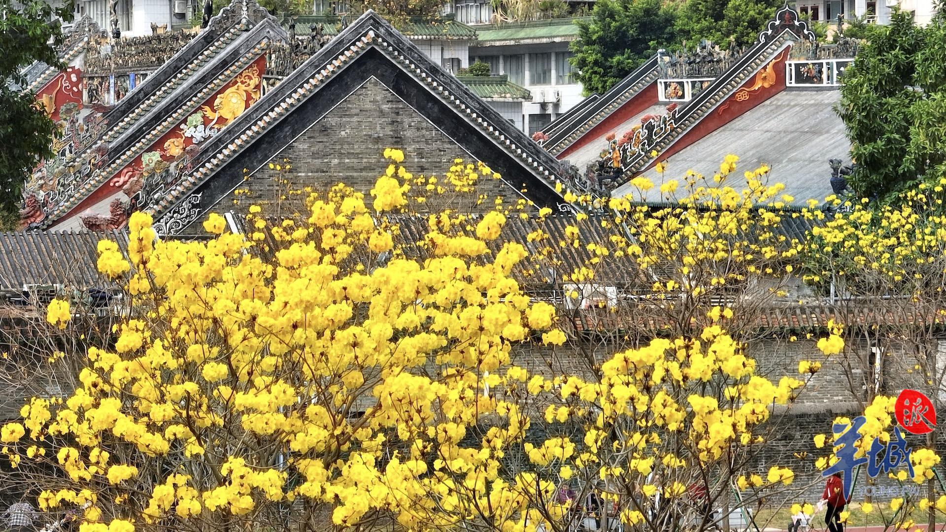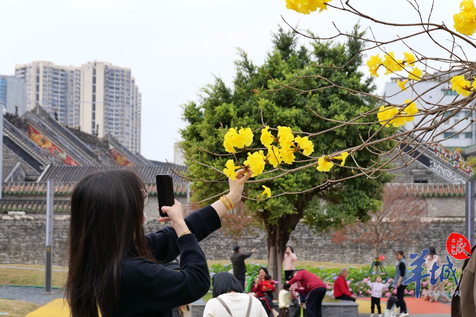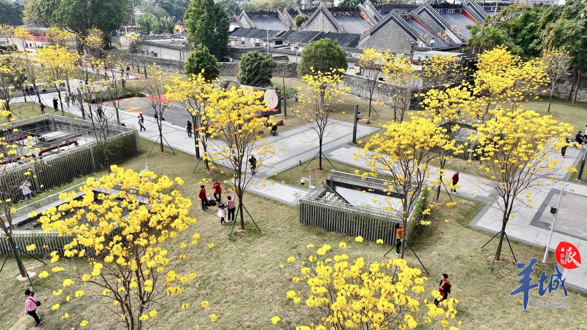 春日到来,种植在陈家祠东广场的黄花风铃木等植物迎来赏花期,以繁花盛开回报等待广场重新归来的街坊。