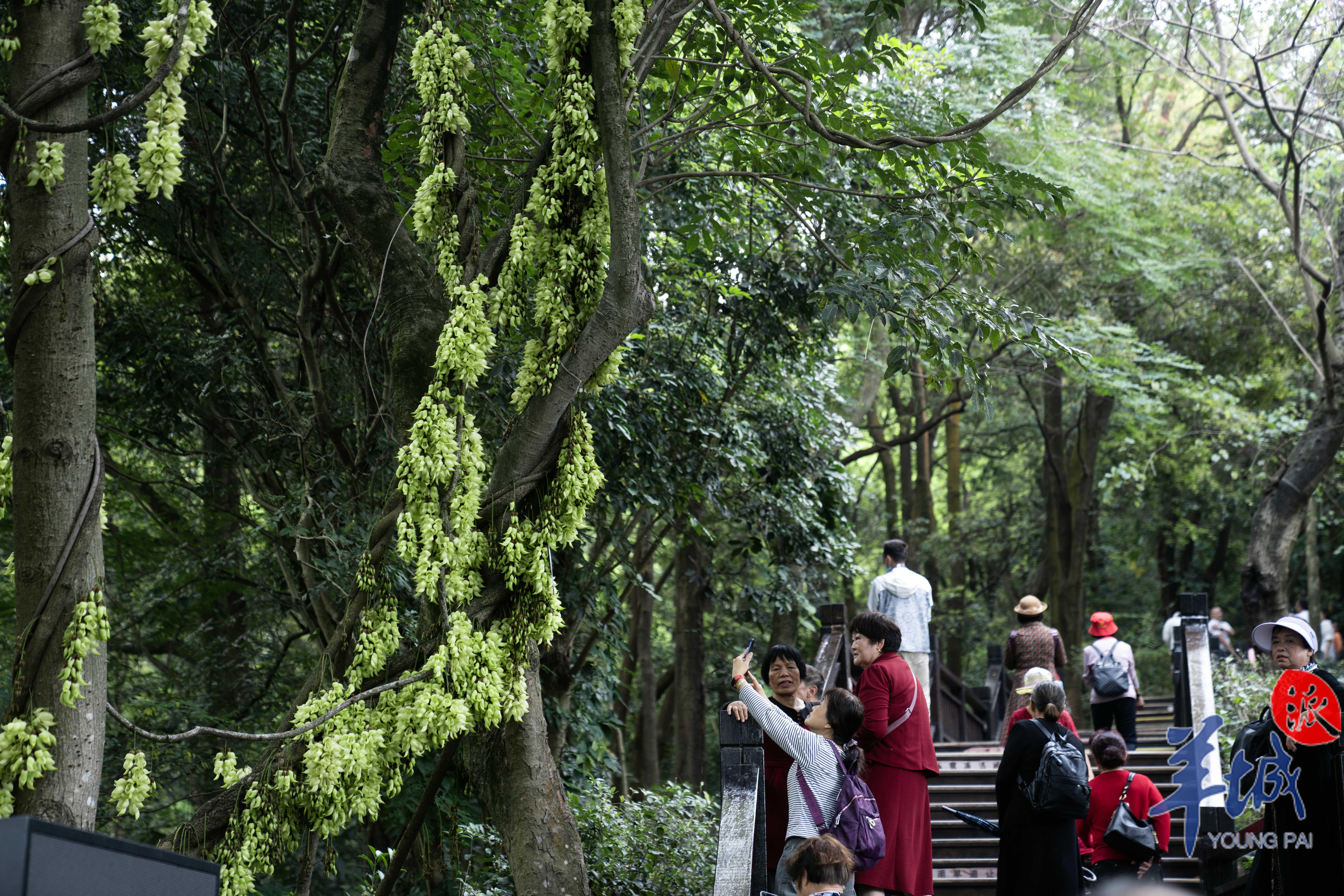 当天上午,天鹿湖森林公园鸟语花香,春意盎然,国家二类保护植物禾雀花正值盛花期,一串串青白相间的“雀鸟”缀满藤蔓,花瓣通透如羽翼,灵动娇俏,微风吹过,花浪起伏似万鸟振翅,小松鼠们在丛林藤蔓间欢快嬉戏。