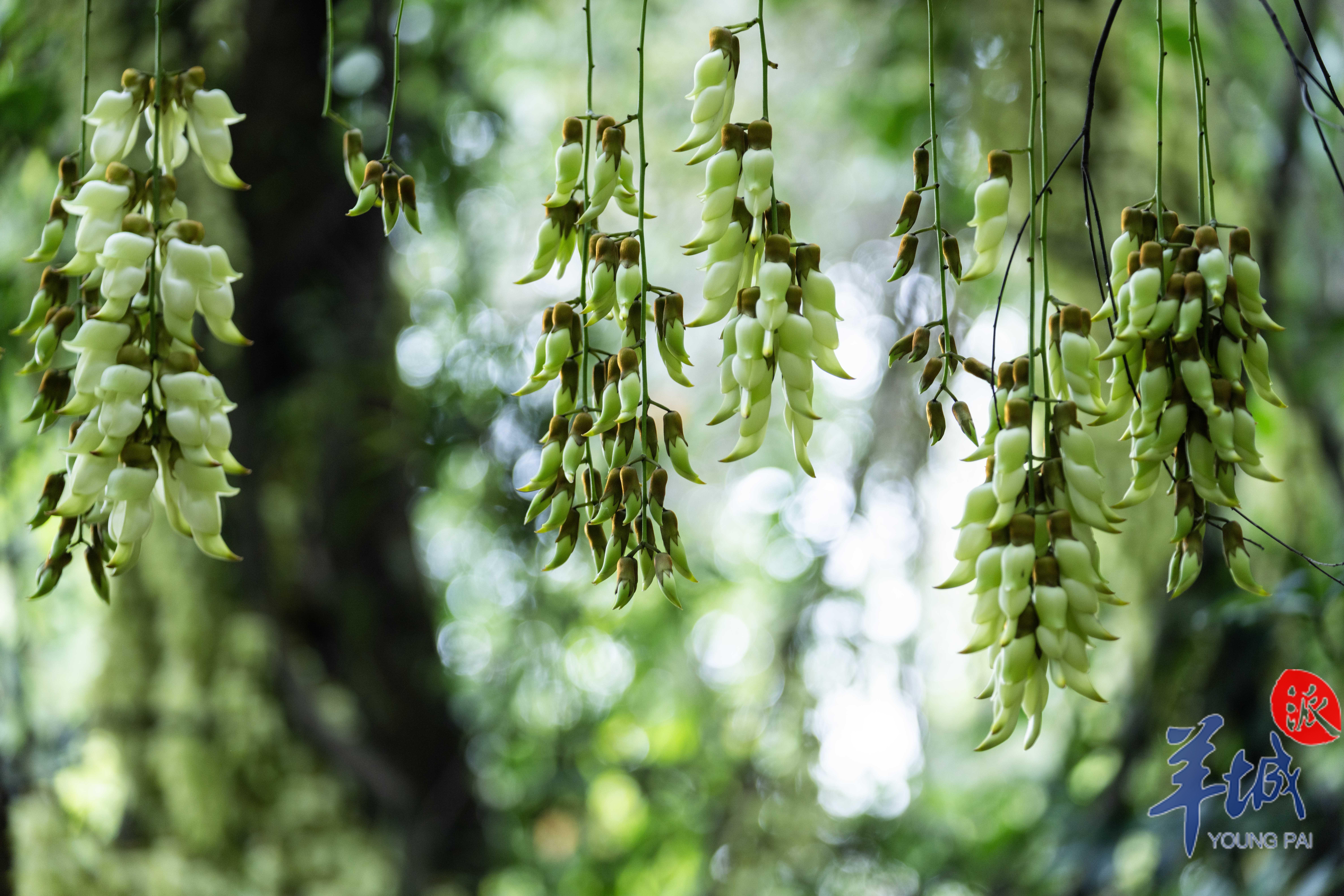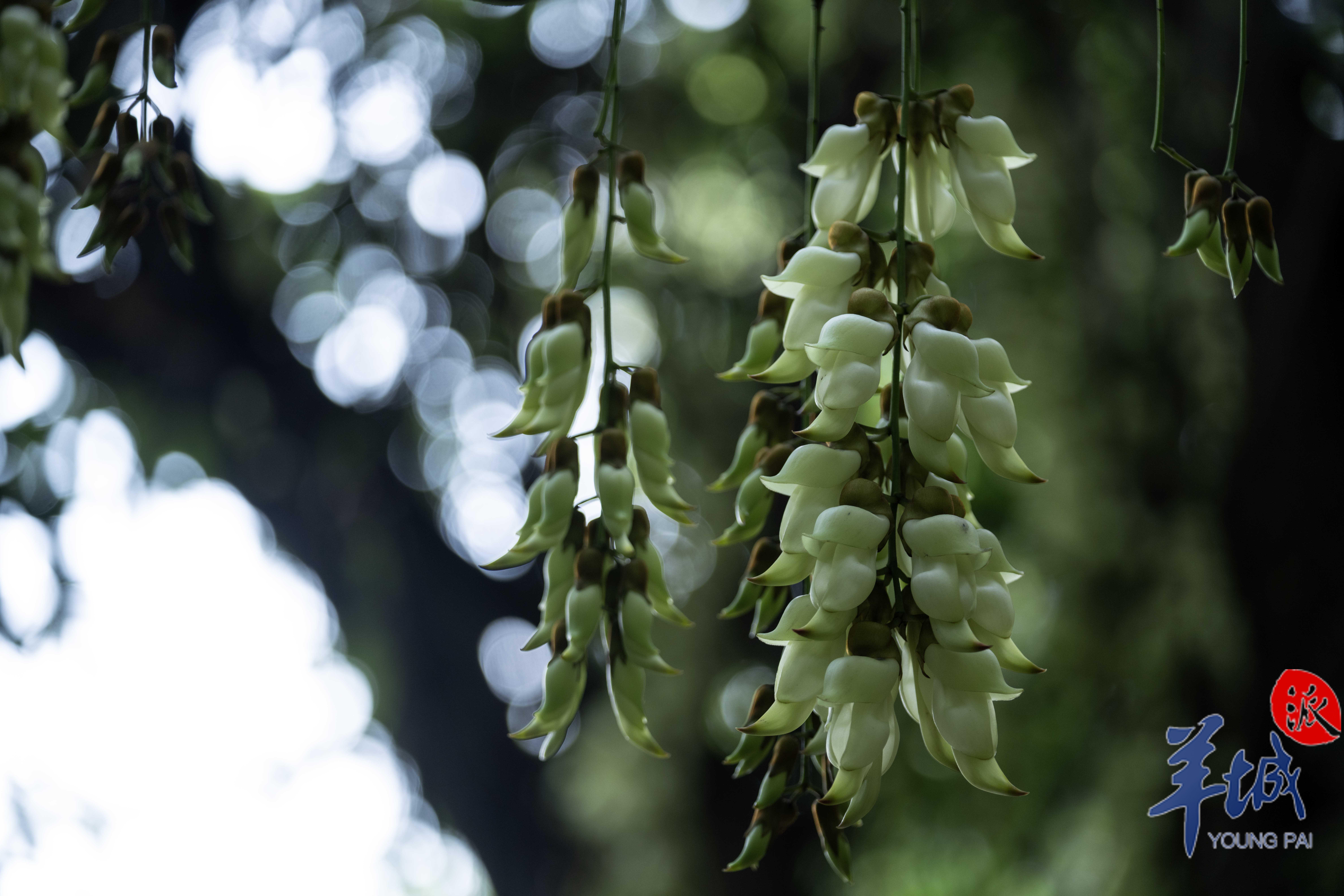 禾雀花花朵形态奇特,花瓣卷拢好似雀鸟的翅膀,初开时呈现淡绿色或淡紫色,到了盛花期则变成乳白色,盛花期时,一串串禾雀花挂满藤蔓,宛如千万只雀鸟栖息枝头,十分惹人喜爱。