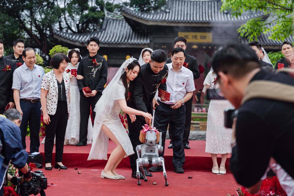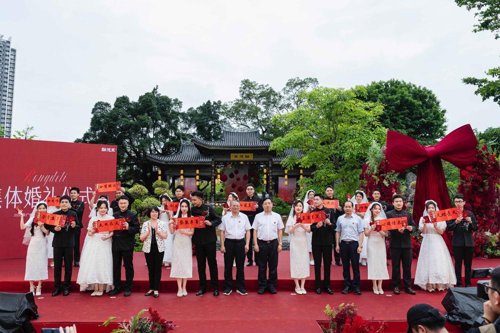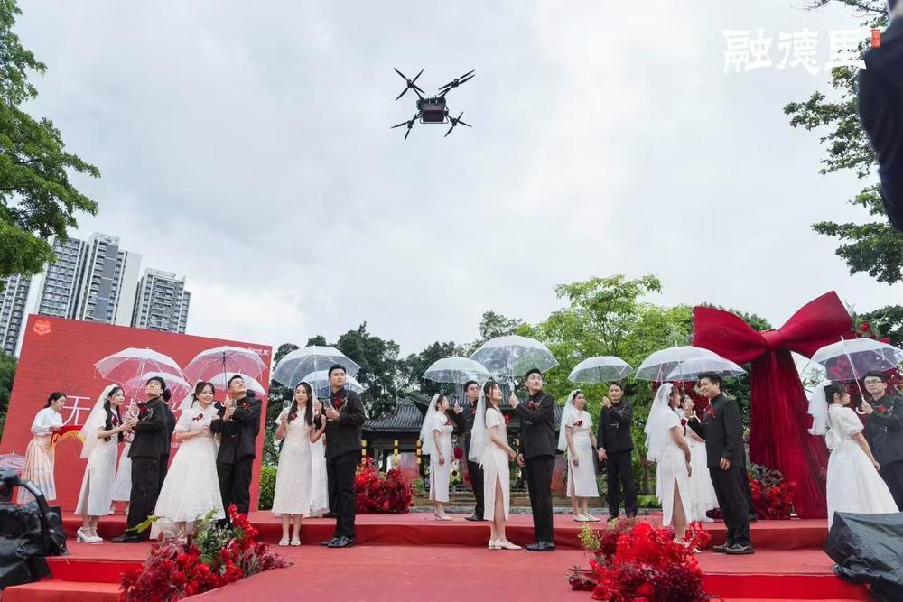 活动当天,融德里举办第二届水上集体婚礼活动,12对青年男女身着典雅的中山装和旗袍轻婚纱,在万千祝福声中揭头纱、交换婚戒、饮交杯酒,无人机从天而降送来婚书,新人在亲友与街坊邻里等千余人的见证下,共同宣读婚书,许下白头到老的诺言。人工智能机器狗向来宾派发喜糖,将幸福传递给每一个人。