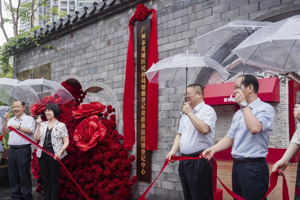 5月18日下午,广州市黄埔区民政局婚姻登记处驻南岗结婚登记中心在融德里历史文化街区揭牌启用,这是广州市又一个设置在国家级景区内的婚姻登记处,也是融德里打造特色婚俗地标、推广在地婚俗文化的最新举措。