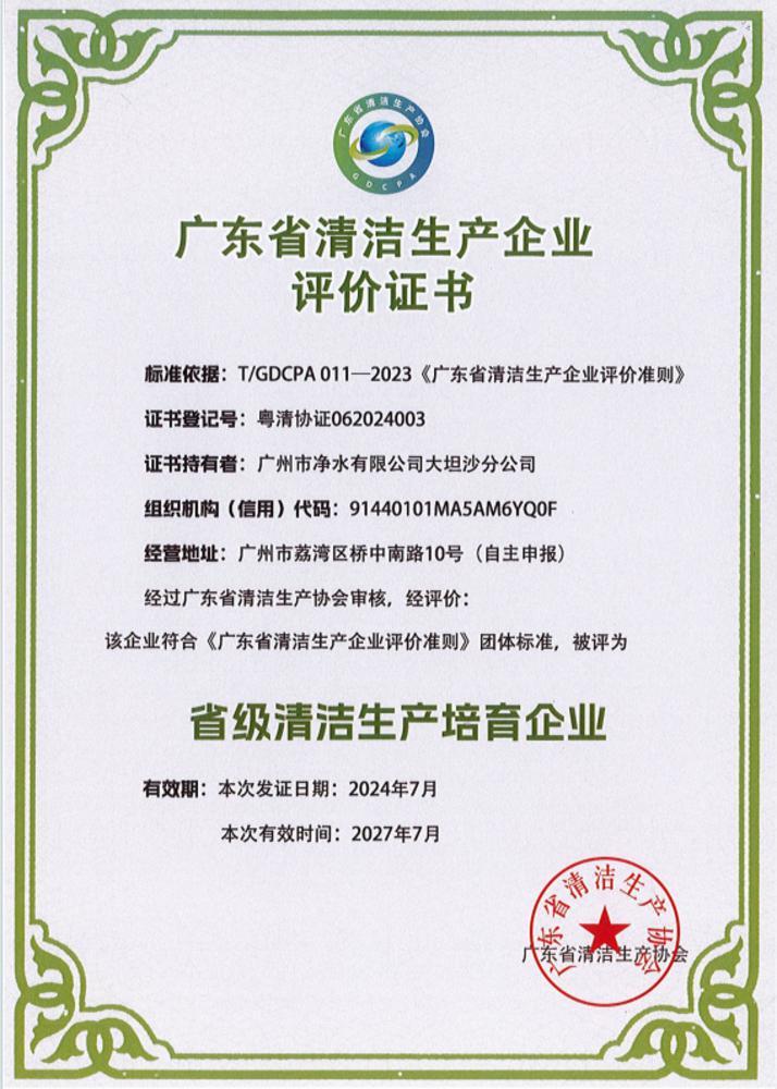 大坦沙净水厂积极拓展再生水应用场景,厂内设备反冲洗、除尘除臭、绿化灌溉等均使用再生水;厂外完成外供再生水取水口接驳,可供外部绿化灌溉、清洁道路等市政取用,日供再生水量可达 1920 吨。厂区 2024 年自来水用量同比 2023 年下降 64%。大坦沙分公司连续三年荣获“广州市清洁生产企业”称号,并于 2024年7月首次荣获广东省清洁生产企业评价证书。